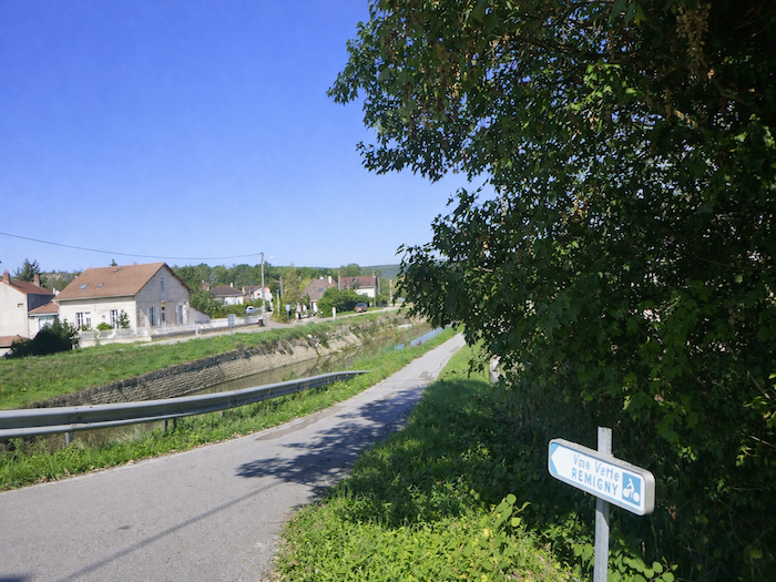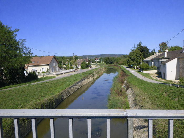 | Bientôt, c’est le Canal du Centre qui accompagne vos pas. La route longe un instant son cours tranquille avant de le franchir sur le Pont du Bouzeron. La tentation est grande de suivre la piste cyclable qui file sous l’arche, glissant le long des eaux calmes. Mais ce serait un leurre, une fausse route, car le parcours du pèlerin ne suit pas le canal : il s’en écarte, fidèle à son propre tracé. |