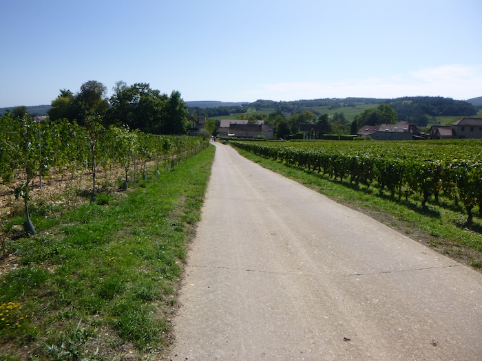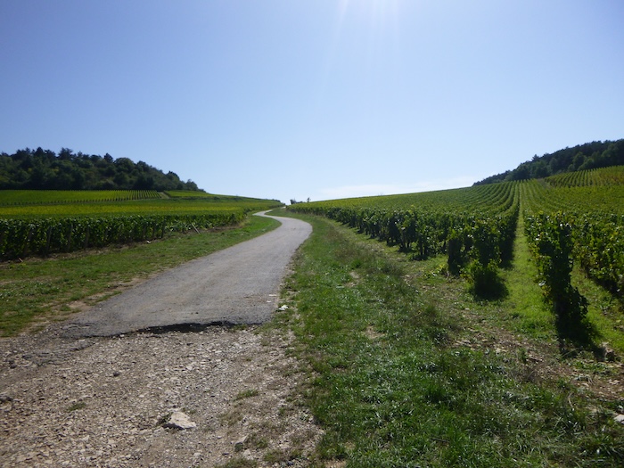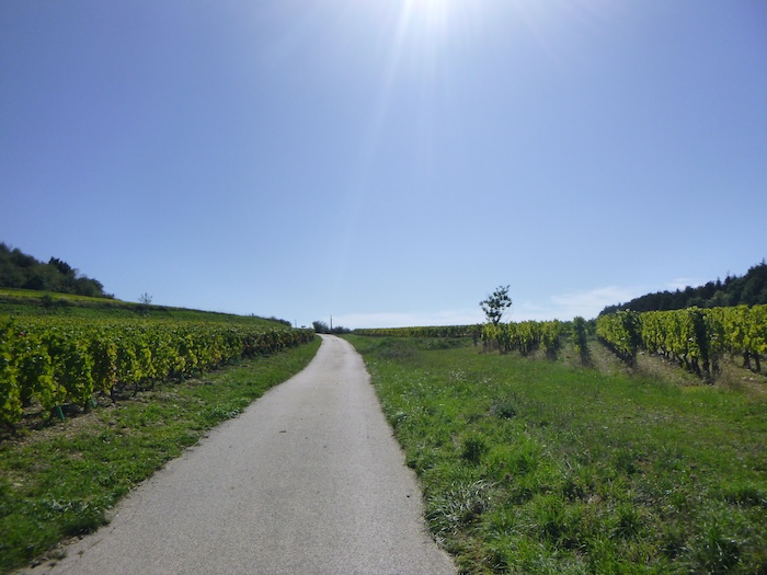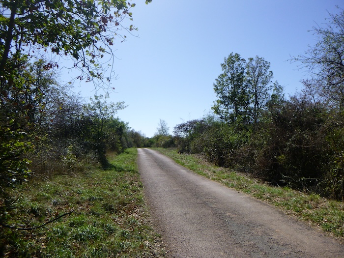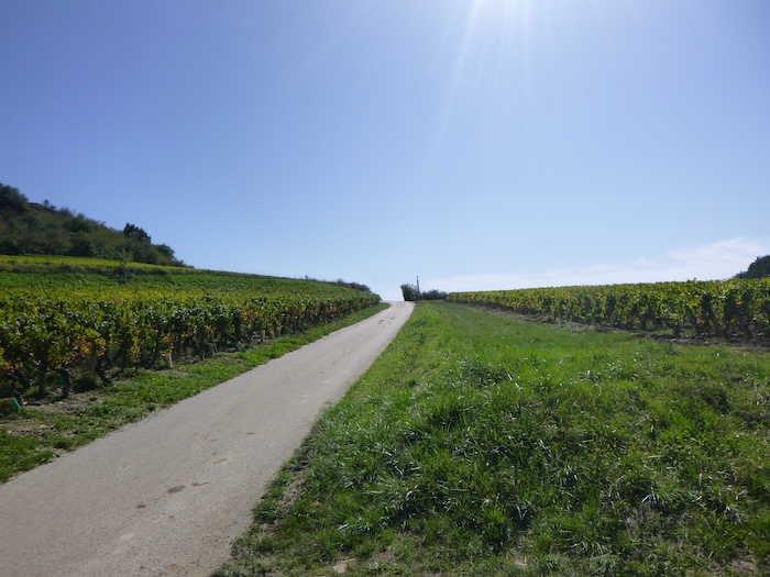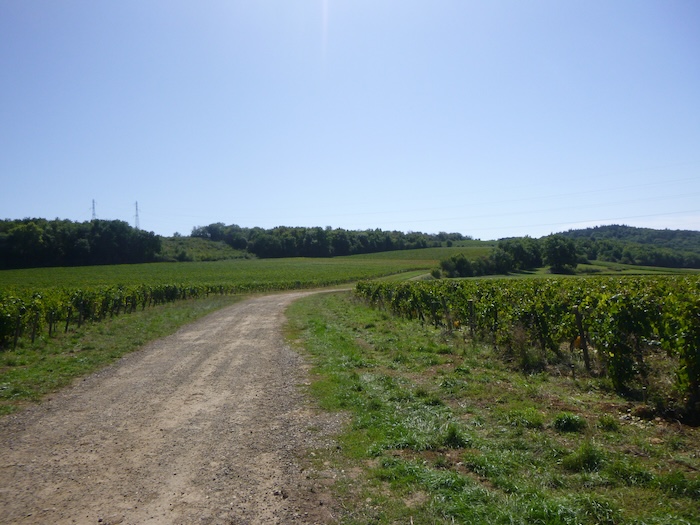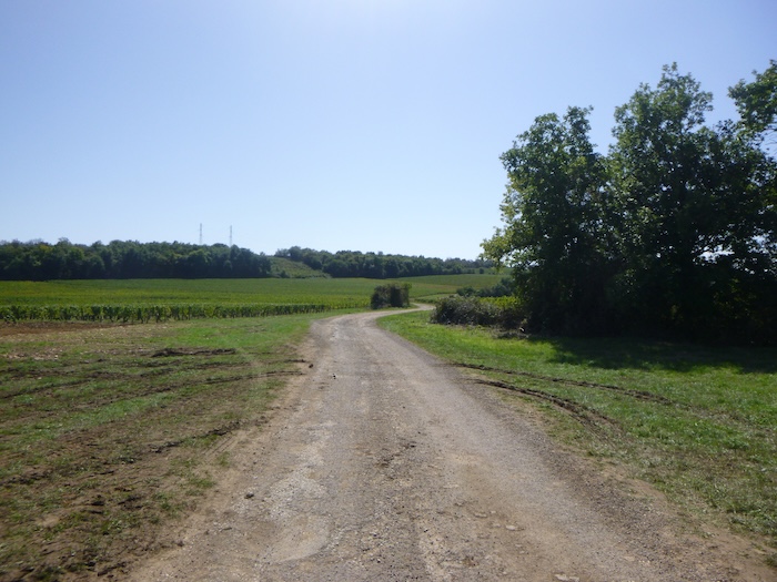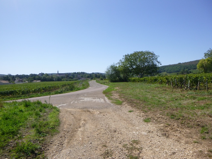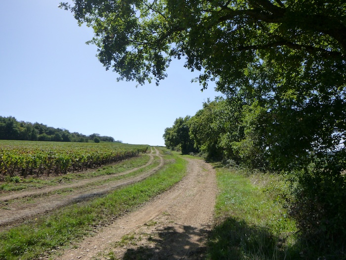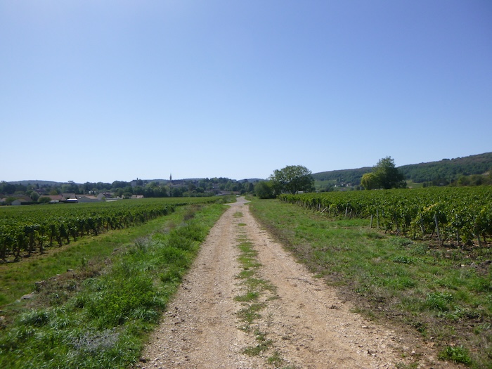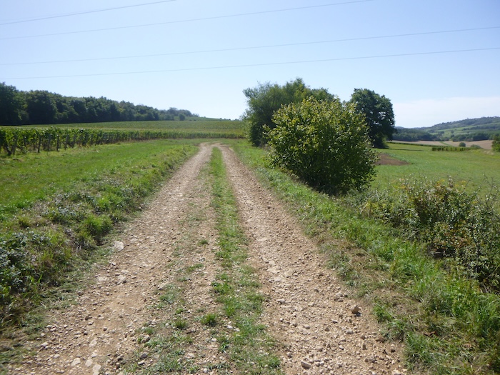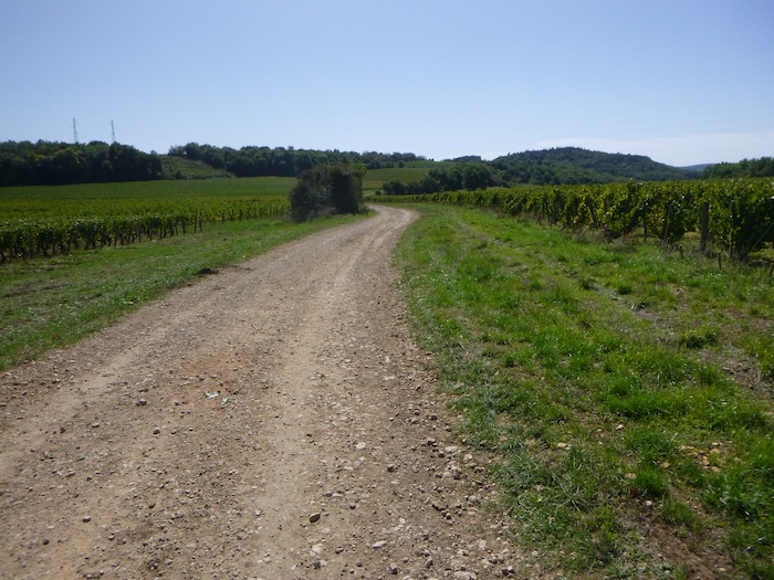 | Peu après, un large chemin musarde à plat, traversant en douceur le vignoble. C’est une piste de terre battue, caillouteuse et ferme sous les pas. C’est le Chemin de Branges, qui file droit vers Rully. |