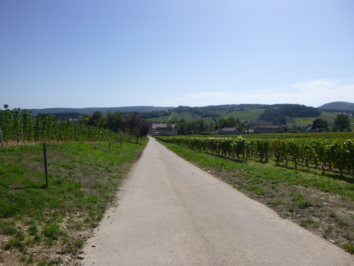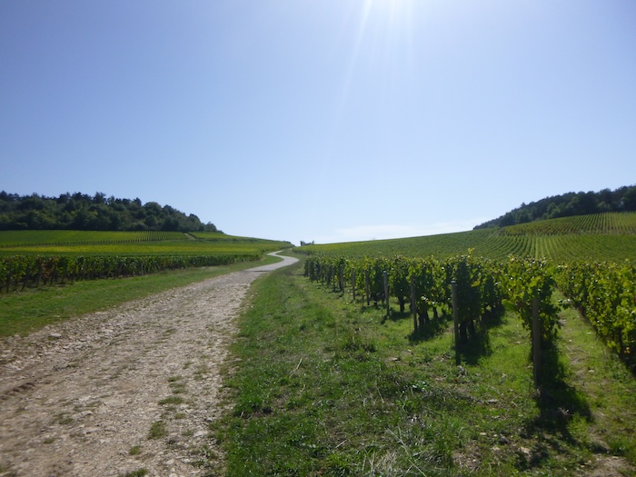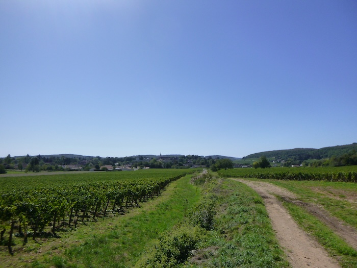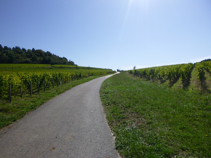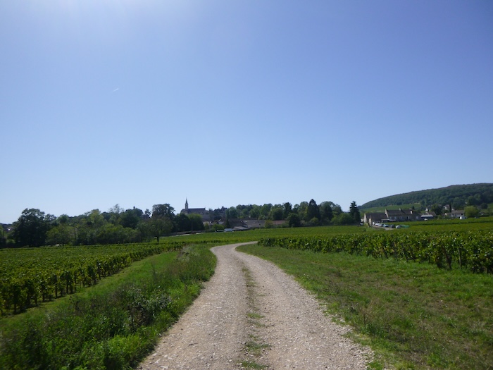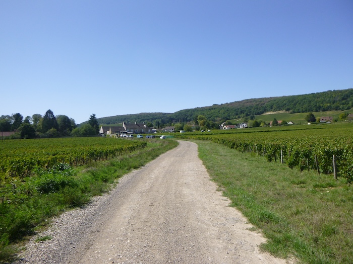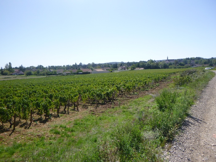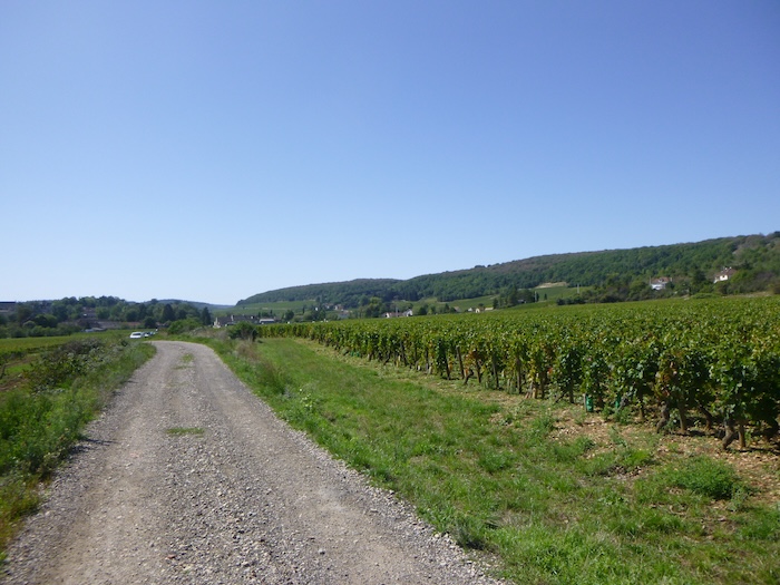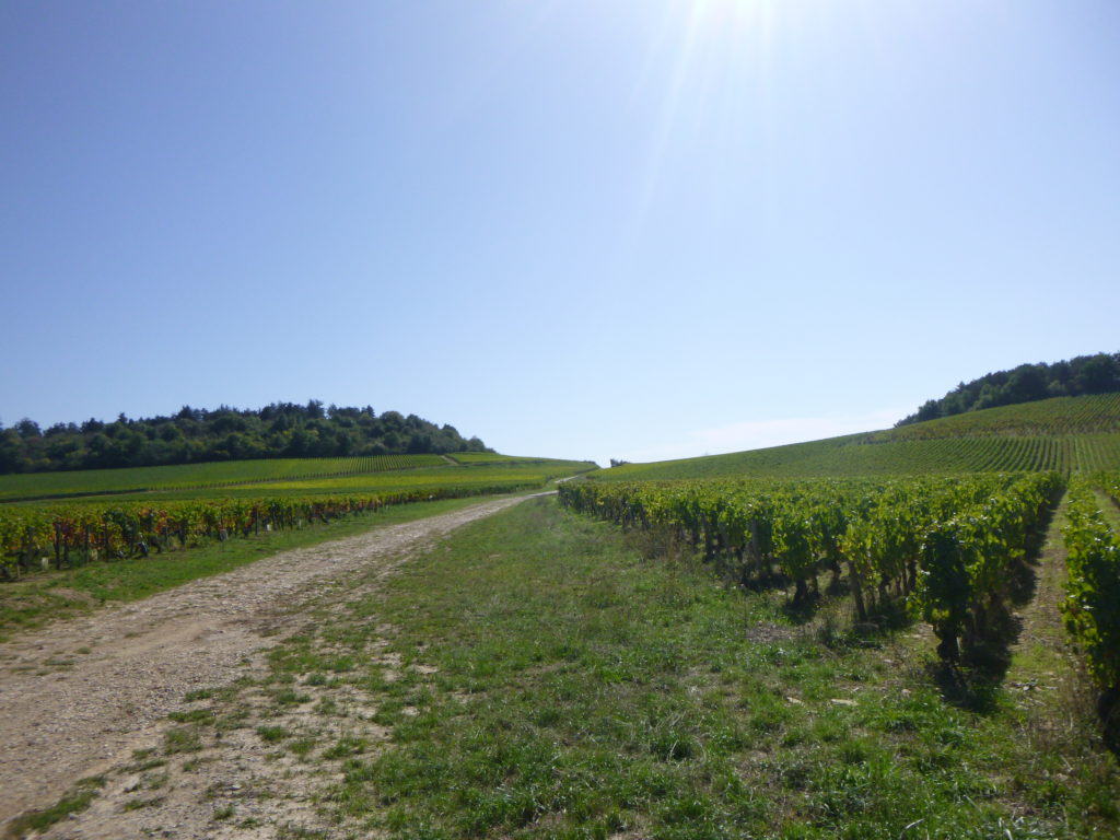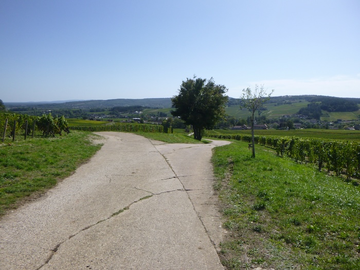 | Peu après, un large chemin musarde à plat, traversant en douceur le vignoble. C’est une piste de terre battue, caillouteuse et ferme sous les pas. C’est le Chemin de Branges, qui file droit vers Rully. |