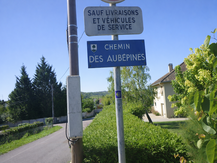 | Après le pont, l’itinéraire prend le nom champêtre du Chemin des Aubépines. Là, enfin, les flèches du Chemin de Compostelle reprennent leur rôle, rassurantes et justes. Sous leur signe, le pèlerin retrouve la certitude de marcher dans la bonne direction. |