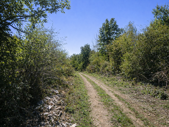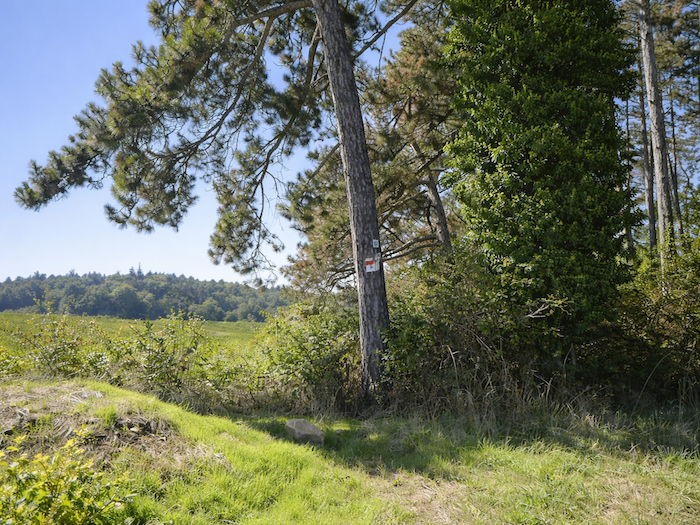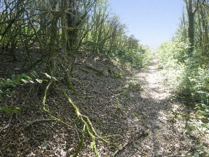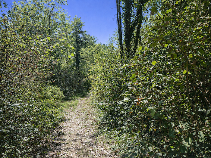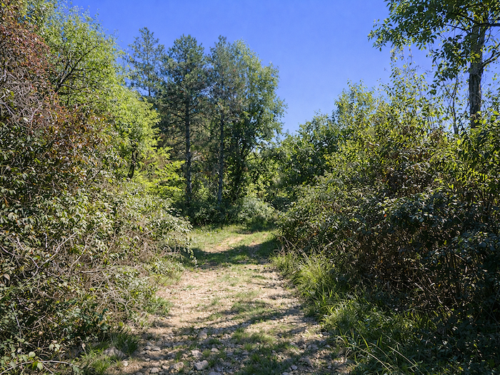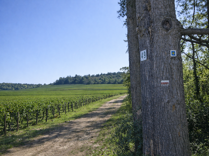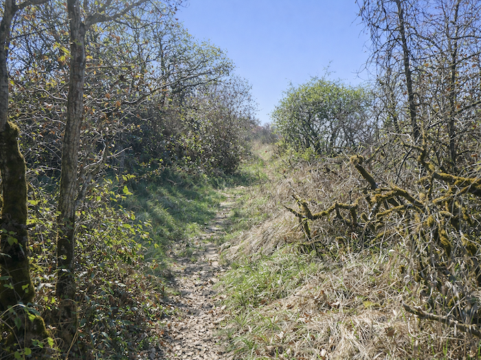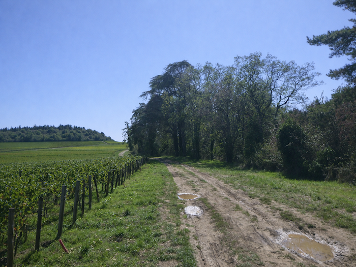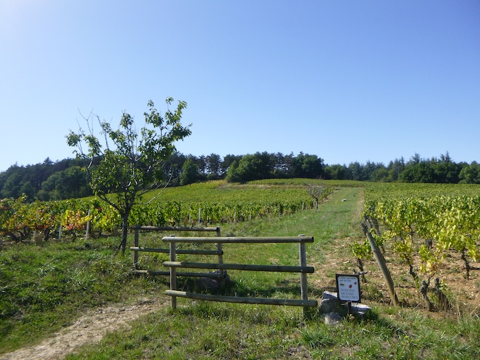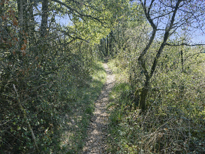 | Mais l’espace ouvert viticole est fugace ici. Aussitôt un chemin plus large rejoint le sous-bois au-dessus du vignoble. |