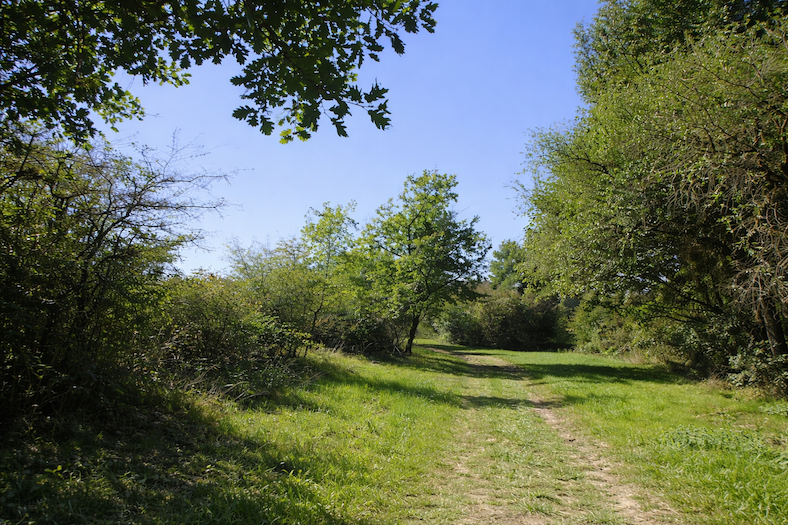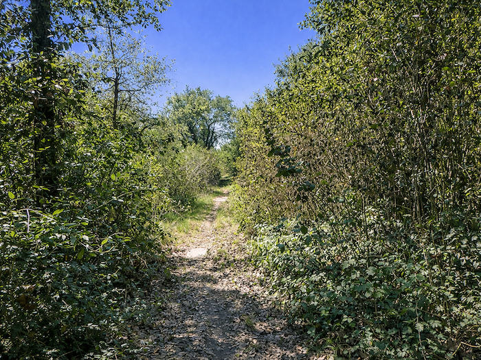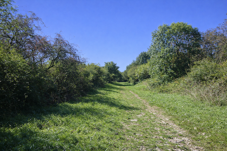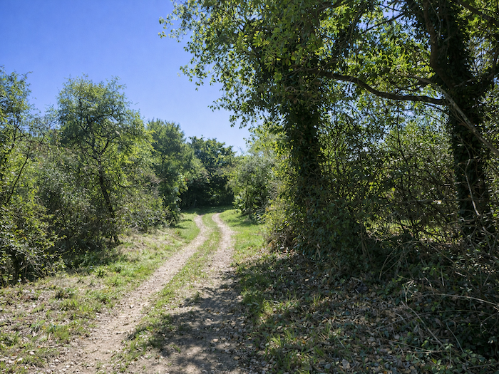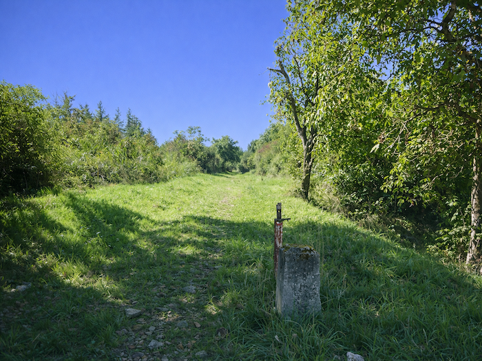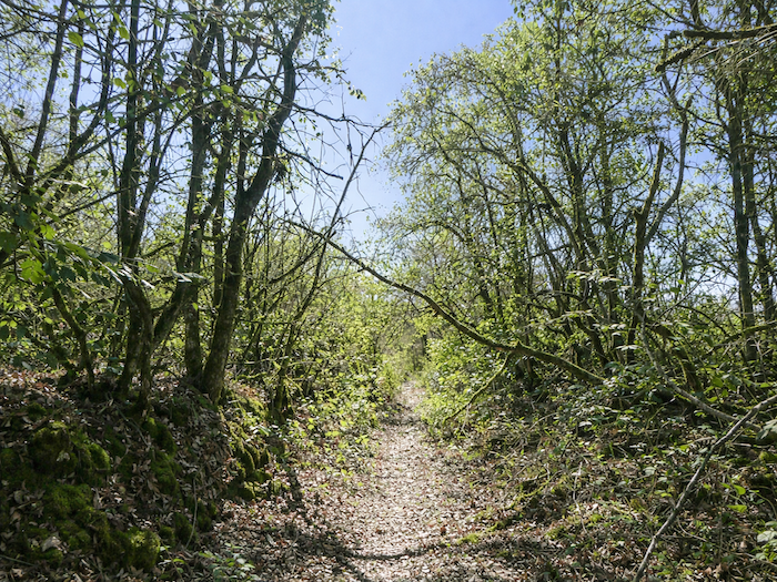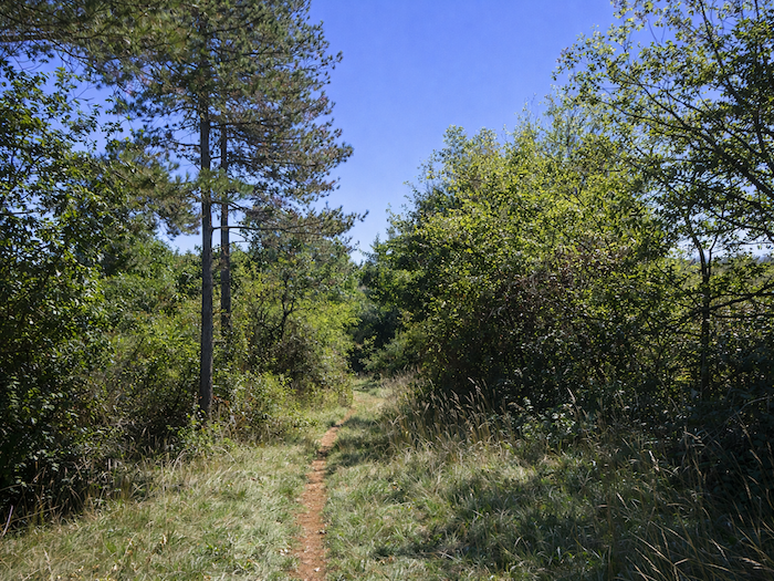 | C’est un joli et large chemin d’herbe qui grimpe avec vigueur dans le sous-bois. Chaque pas s’enfonce dans la verdure, et la pente oblige à lever le souffle comme pour mieux sentir le rythme de la nature environnante. |