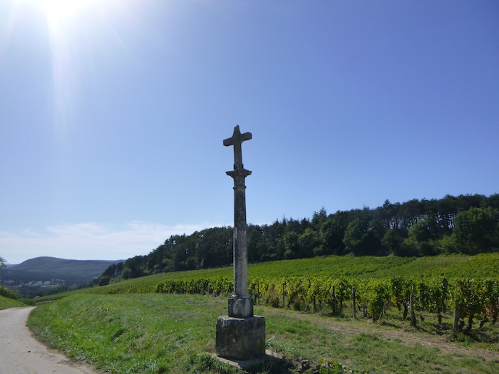 | Au sommet, une croix de pierre se dresse, immobile et vigilante. Elle veille depuis des siècles sur le vignoble et ses hommes, témoin silencieux des saisons, des labeurs et des prières. Comme un phare, elle domine l’horizon, rappelant que le chemin n’est jamais seulement terrestre. |