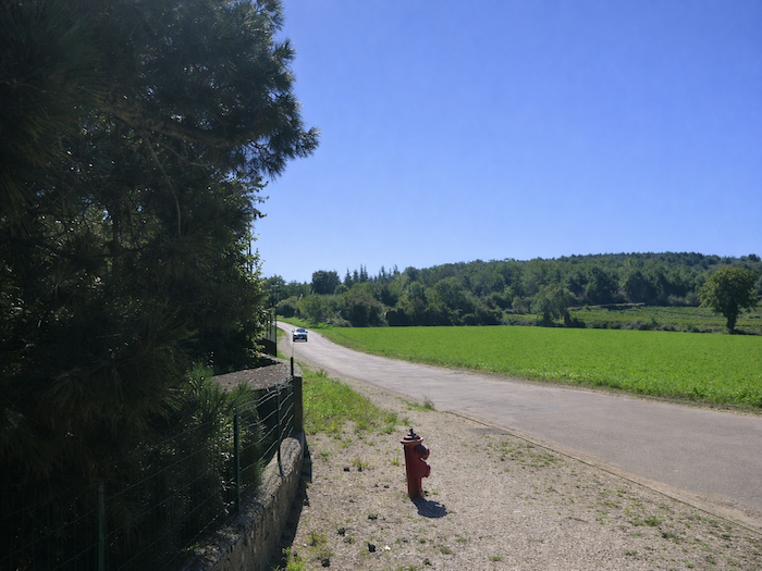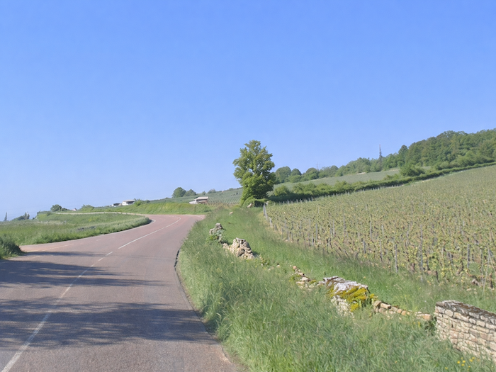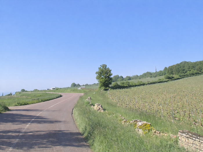 | Depuis Germolles, il reste encore trois kilomètres à parcourir avant de rejoindre Givry. Dès les premiers pas, on remarque que les vignes se sont comme effacées, disparues presque par enchantement, comme si le paysage avait voulu ménager une pause, un silence végétal avant la réapparition du vignoble. Le regard se perd alors sur des champs plus nus, des talus verts, des horizons moins marqués, où l’on croit entendre la terre reprendre son souffle. Pour votre bonheur, la circulation n’est pas effrénée sur l’axe. |