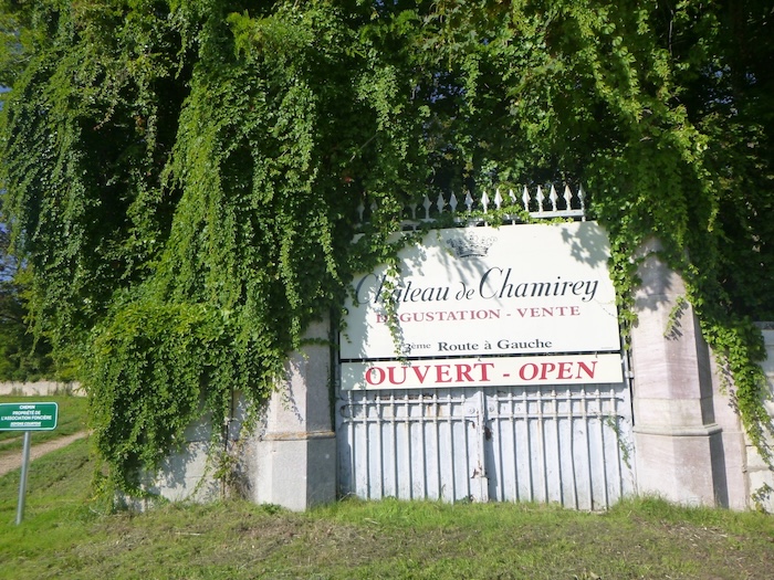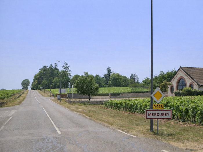 | Ici s’étend encore le vignoble de Mercurey sur les hauteurs, passant devant le caveau du Château de Chamirey au bord de la route. |