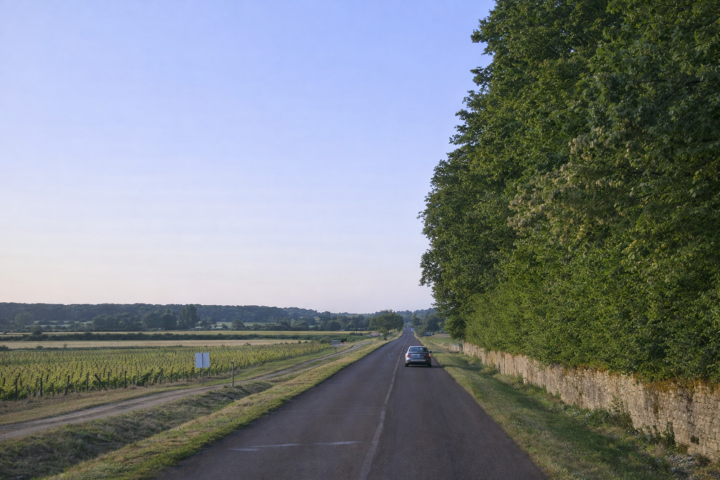 | L’œil attentif devinera parfois, au-dessus de la chaussée, des alignements de vignes qui s’étirent comme une frise régulière sur les coteaux, mais le vignoble de Mercurey demeure ici modeste, comme une respiration brève dans l’immensité bourguignonne. Lorsque l’on quitte peu à peu la banlieue, la route s’allonge, longeant le vignoble comme un ruban tranquille. La circulation, loin d’être oppressante, s’écoule en douceur, et le marcheur, s’il prend soin de ses pas, peut aisément progresser sur la bande herbeuse qui borde la route, trouvant là un terrain plus souple qu’un simple trottoir. Le silence est parfois brisé par le grondement d’un moteur. |