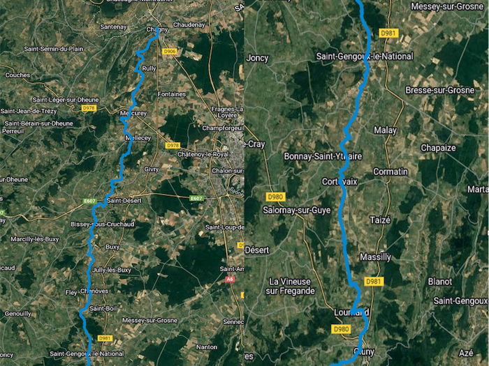 | Le parcours rejoint alors la grande route départementale de Châlons-Sur-Saône. |