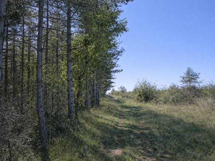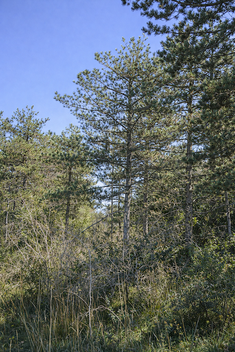 | Désormais, il n’y a plus que des pins maigrelets, dressés comme des silhouettes effilées, le long du chemin. La nature se fait plus sauvage, plus dépouillée, comme si l’on quittait la familiarité des bois feuillus pour entrer dans une terre plus âpre, mais habitée d’une beauté austère. |