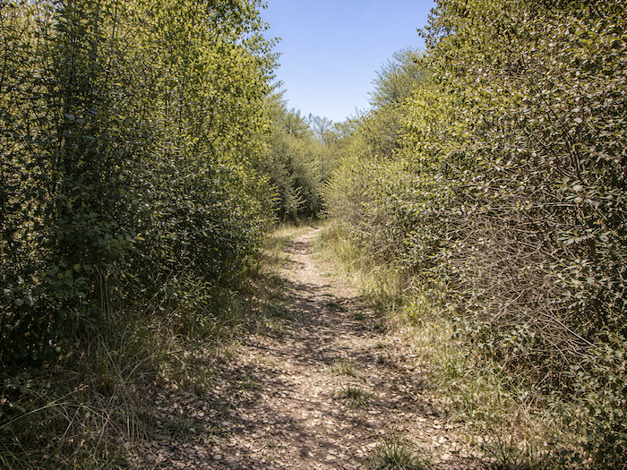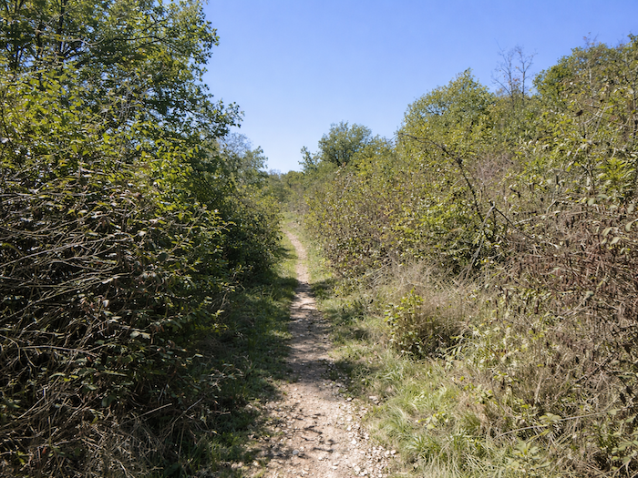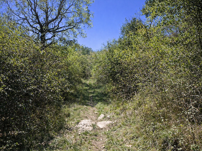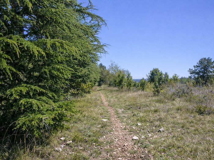 | Le chemin, désormais étroit, amorce sa descente. Il s’enfonce dans les broussailles, comme s’il voulait se cacher un instant avant de livrer à nouveau le paysage. |