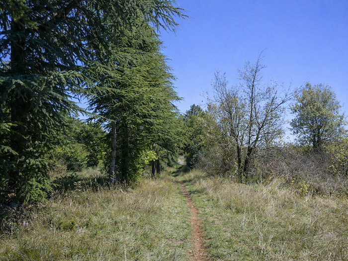 | Au bout de la crête, le chemin se rétrécit et amorce une descente régulière. Le paysage change soudain, prenant des allures de steppe, avec ses pelouses sèches où alternent les chênes clairsemés et les conifères. La marche devient plus méditative, comme si la terre elle-même invitait à ralentir pour mieux en goûter l’austère beauté. |