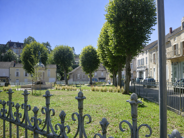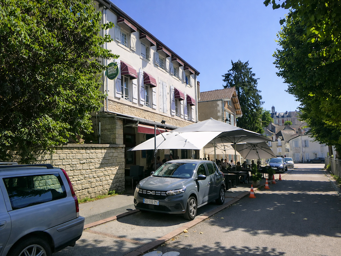 | Au centre du bourg, s’élève un hôtel-restaurant accueillant, lové à l’ombre d’un petit parc verdoyant. Les arbres, larges et généreux, y déploient leurs ramures comme un dais protecteur, offrant un havre de fraîcheur aux voyageurs et aux habitants. |