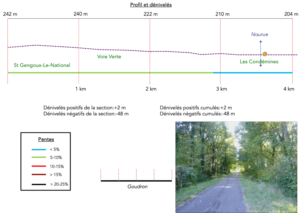 Au bord du ruisseau, la piste longe la petite gare des Condamines, bâtisse silencieuse et sans avenir, sans doute abandonnée pour l’éternité. Sa façade fermée, rongée par le temps, évoque encore les haltes d’autrefois, où quelques voyageurs pressés descendaient en hâte sur le quai.