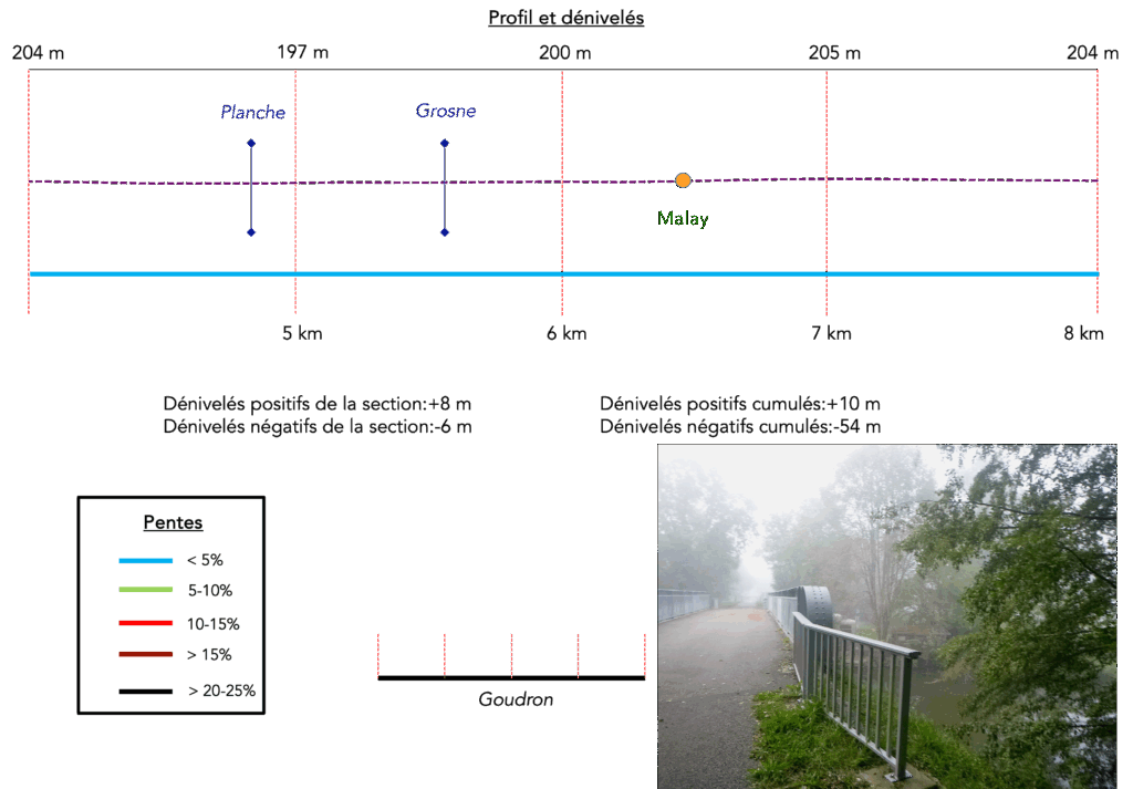 Après le passage de la Grosne, la piste longe la gare abandonnée de Malay, fantôme d’un passé ferroviaire, avant qu’une pancarte n’indique la direction de l’église de Malay. Mais les cyclistes, impatients de distance, et les marcheurs, happés par le fil du chemin, poursuivent tout droit, même par beau temps, sans se détourner.