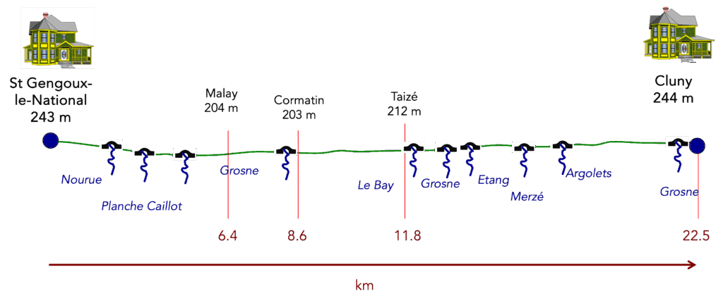 Difficulté du parcours : Le trajet présente est quasi plat, avec parfois une minime pente que vous ne remarquerez guère (+71 mètres/-67 mètres). Ce n’est pas le cas si vous suivrez le Chemin de Compostelle fléché depuis St Gengoux-le-National (+367 mètres/-358 mètres).