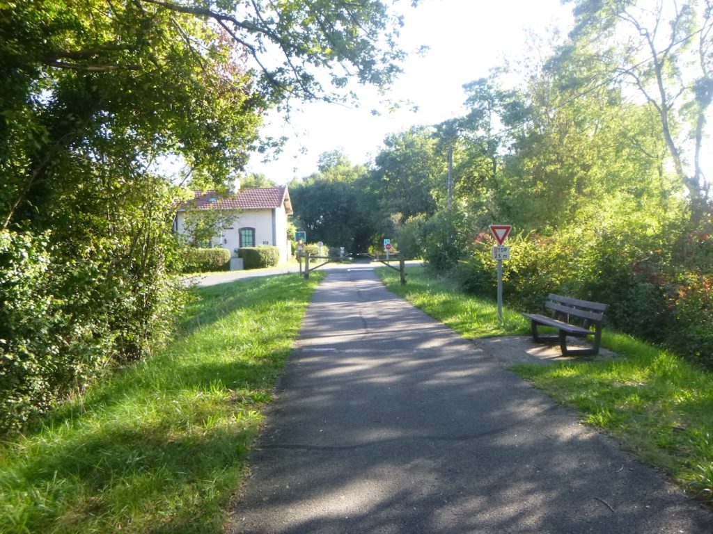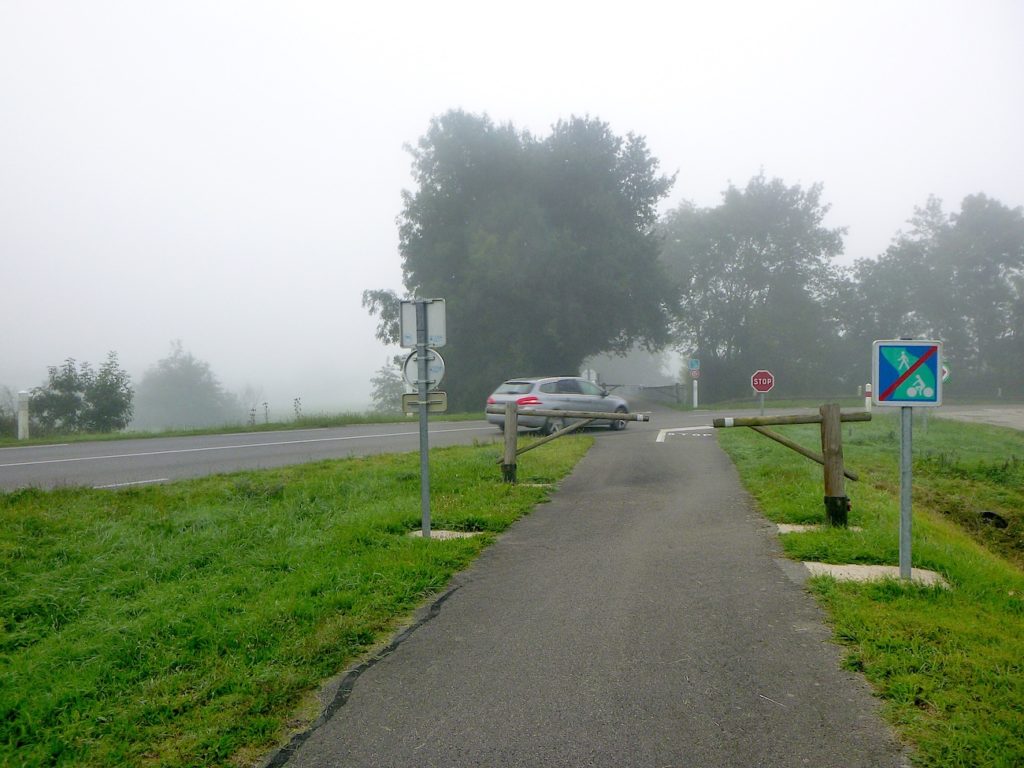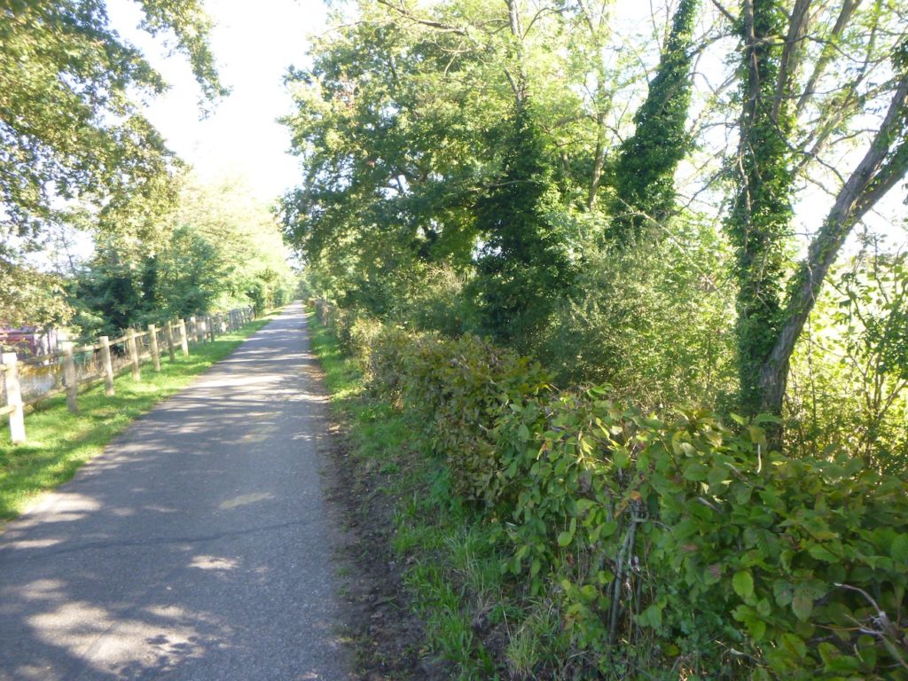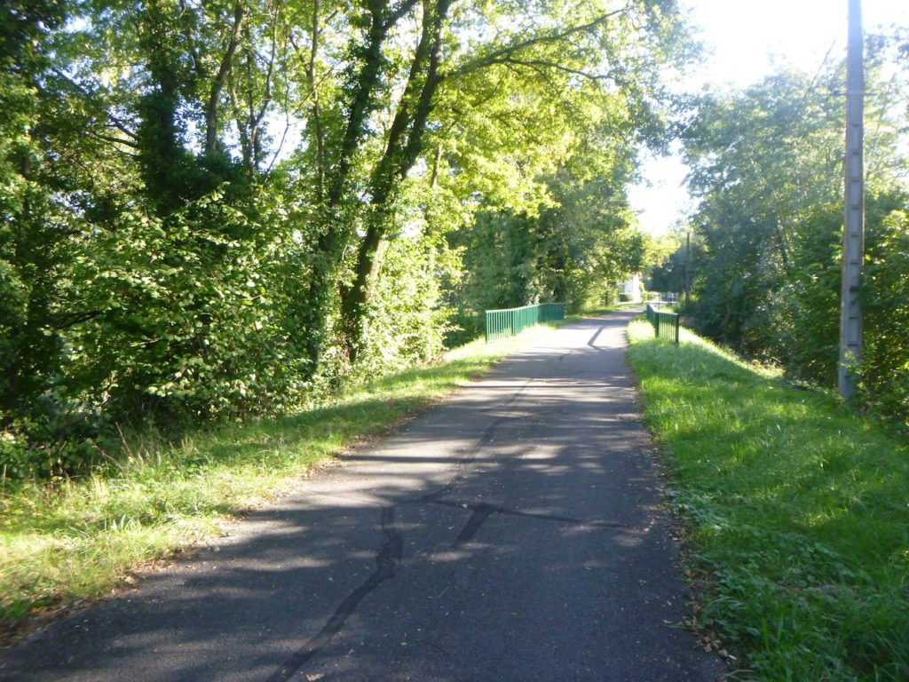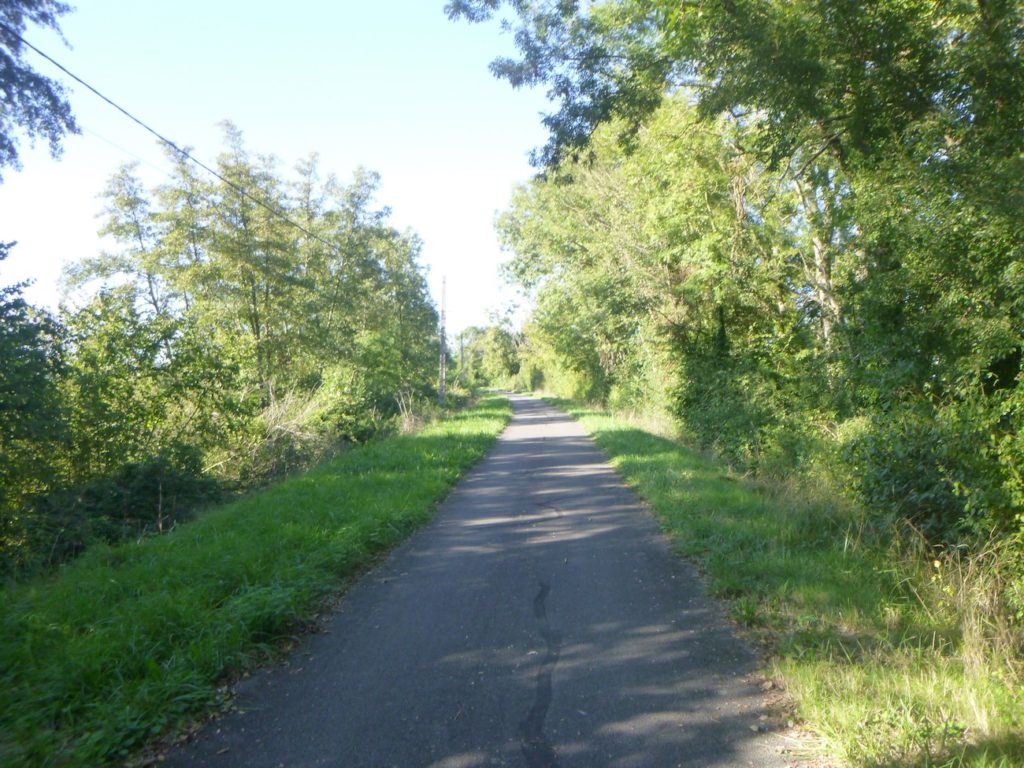 Rien ne vient accrocher le regard, rien ne fait scintiller l’œil dans ce tronçon, si ce n’est la certitude de vous rapprocher peu à peu de la grande départementale D981. Cette route, large et sonore, paraît annoncer le monde moderne qui s’impose de l’autre côté de la haie : voitures rapides, ruban gris qui file, contraste net avec la lenteur paisible de la voie verte.