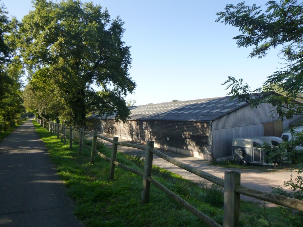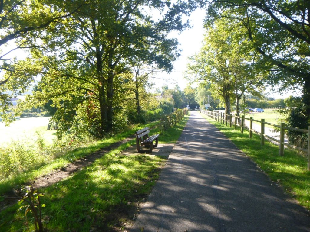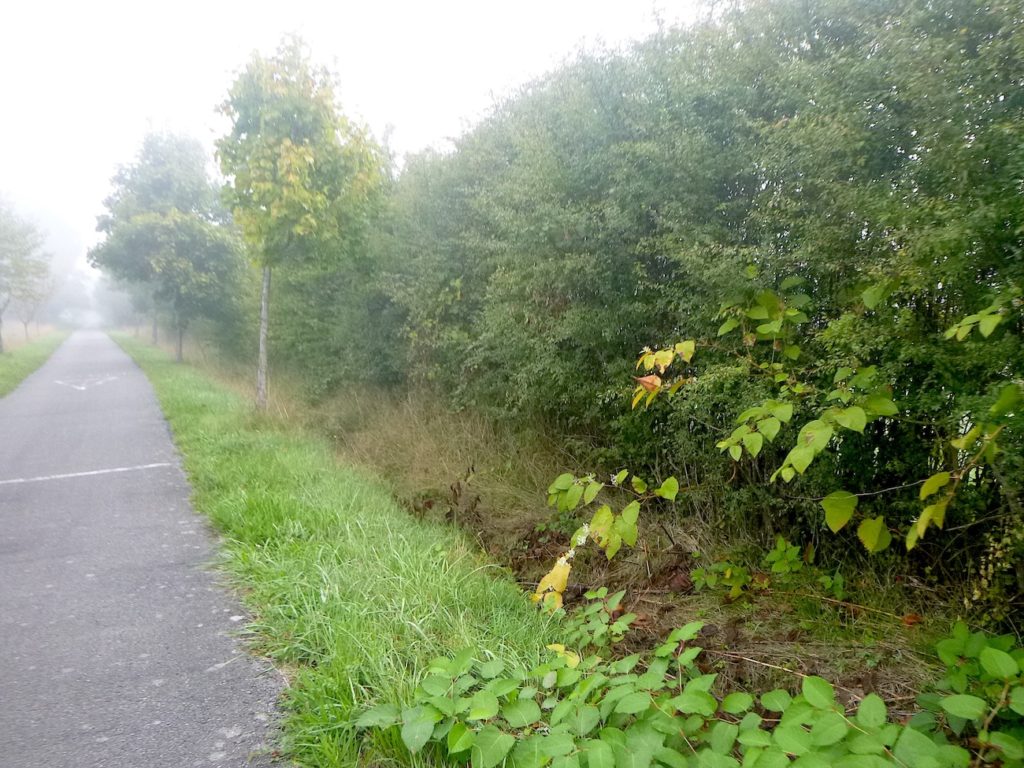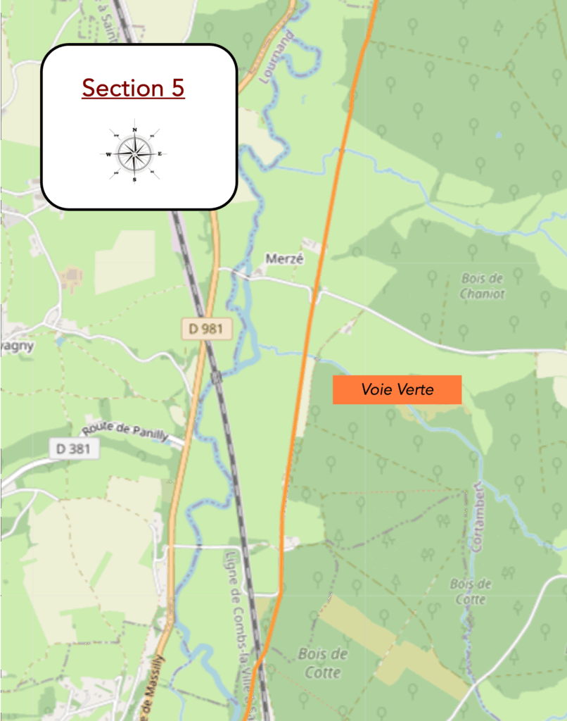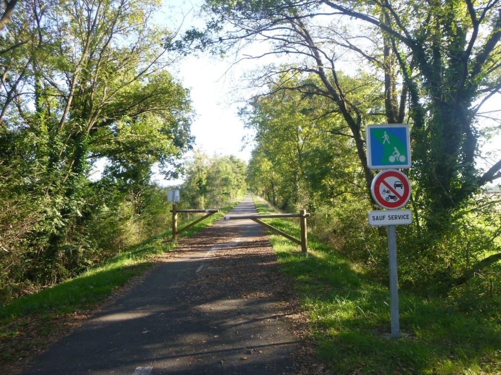 Rien ne vient accrocher le regard, rien ne fait scintiller l’œil dans ce tronçon, si ce n’est la certitude de vous rapprocher peu à peu de la grande départementale D981. Cette route, large et sonore, paraît annoncer le monde moderne qui s’impose de l’autre côté de la haie : voitures rapides, ruban gris qui file, contraste net avec la lenteur paisible de la voie verte.