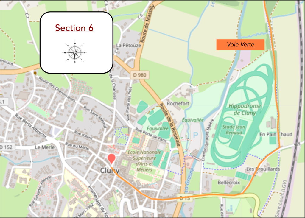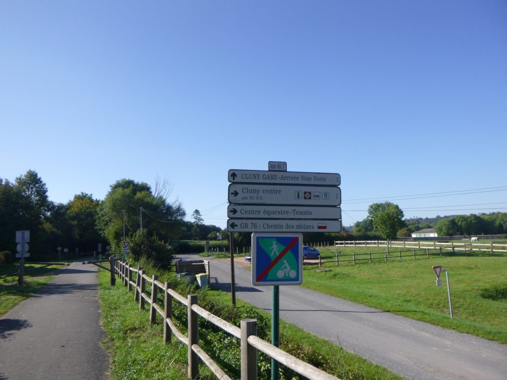 Pour les passionnés de la petite reine, la piste cyclable poursuit son cours au-delà, mais pour vous, elle s’interrompt près du parking, à deux pas d’un centre équestre. C’est Cluny déjà, à seulement un kilomètre du centre. La ville se devine dans ses contours, entre patrimoine et quotidien.