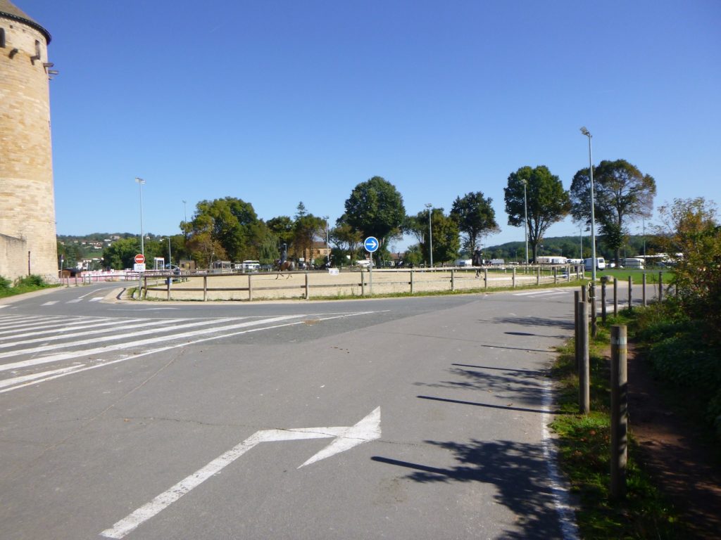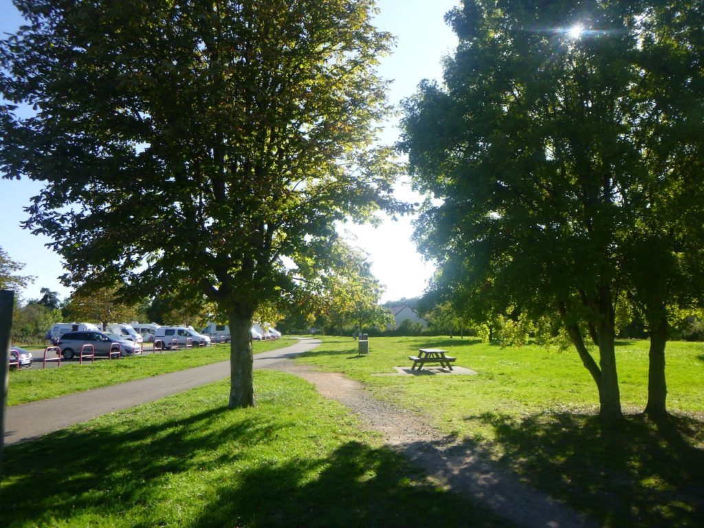 La piste s’engage ensuite dans un parc ombragé, longeant les rangées méthodiques de camping-cars, comme un étrange bivouac moderne installé sur les traces des anciens voyageurs. Elle file droit vers la départementale D49, qu’elle traverse rapidement sur un viaduc, coupant la route comme un fil tendu dans le tissu du paysage.