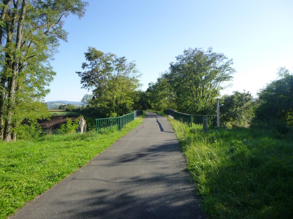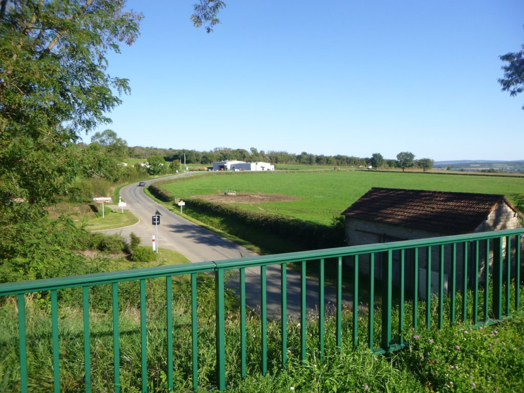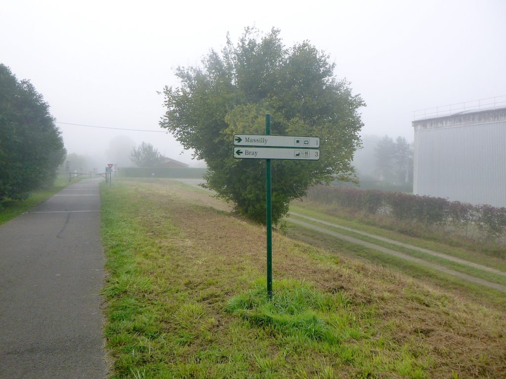 Beaucoup plus loin, après 1 bon kilomètre de rectiligne, la piste passe sous un pont où s’élance la route reliant Malay à Cortemblin. Si l’on prend la peine de gravir la butte, on découvre, depuis ce promontoire, l’image presque déroutante de la piste : une ligne droite qui s’enfonce à perte de vue dans un horizon bouché, avalée par la brume ou par la monotonie. Là encore, la rectitude domine, car les trains, jadis, n’avaient que mépris pour les virages.