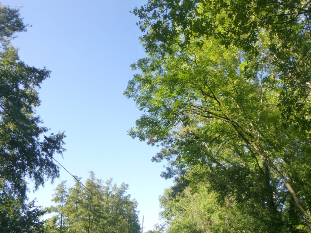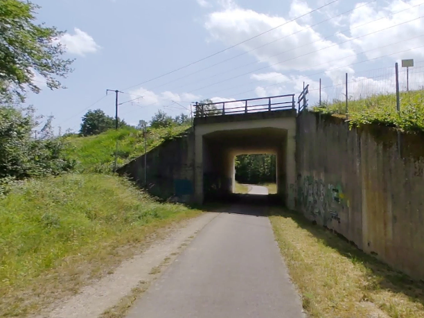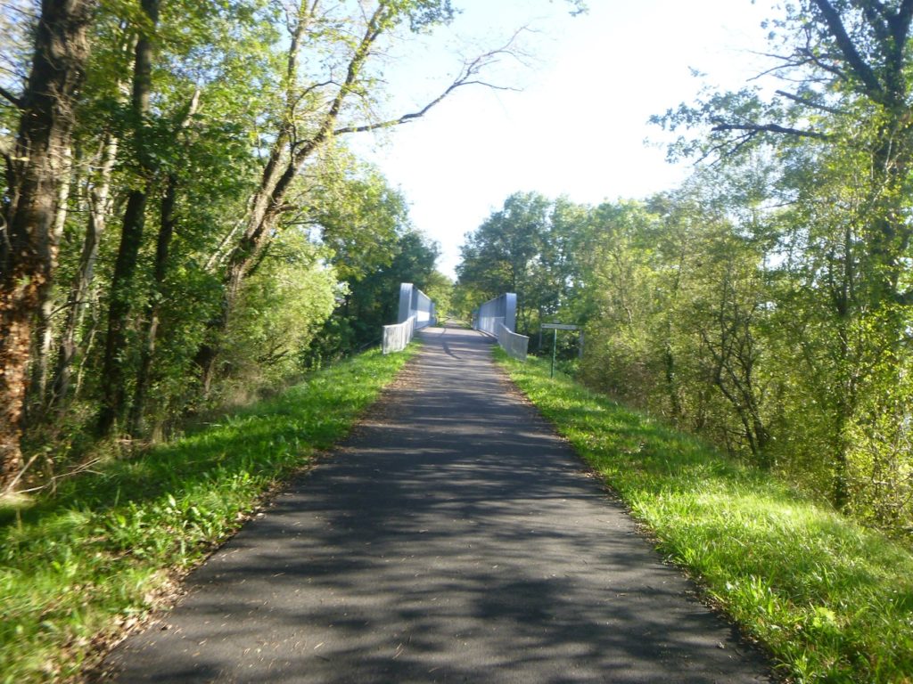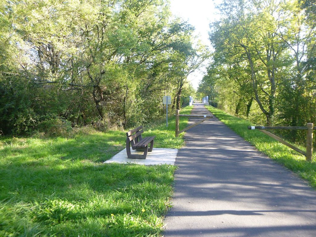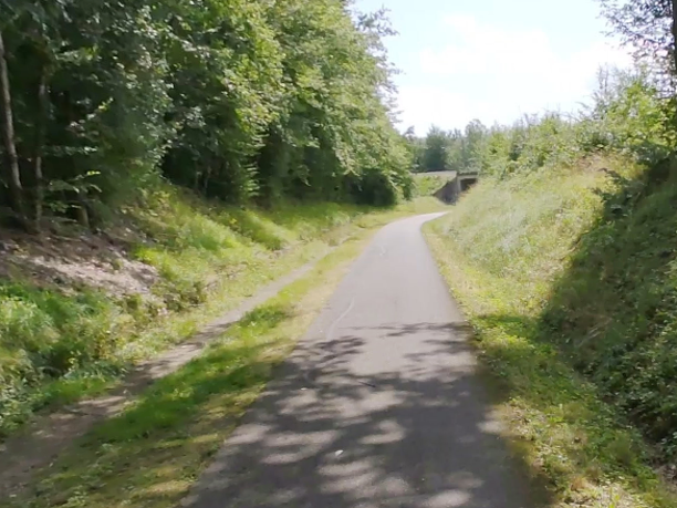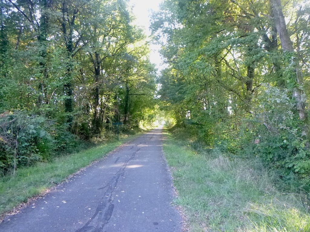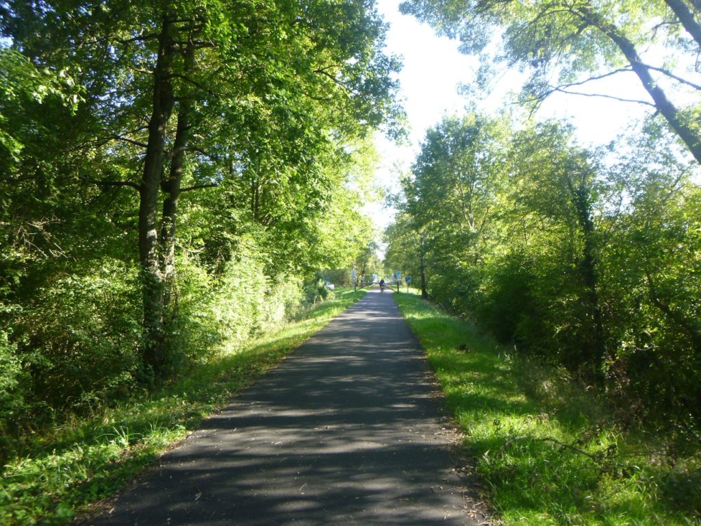 Puis, la piste cyclable s’étire encore, presque docile, sur près d’un nouveau kilomètre, toujours protégée par l’ombre bienveillante des feuillus. Leurs ramures se rejoignent parfois au-dessus de la voie, comme pour former une nef végétale où le voyageur avance en silence, enveloppé d’un parfum de mousse et d’humus.