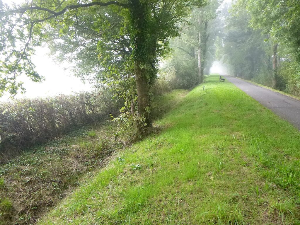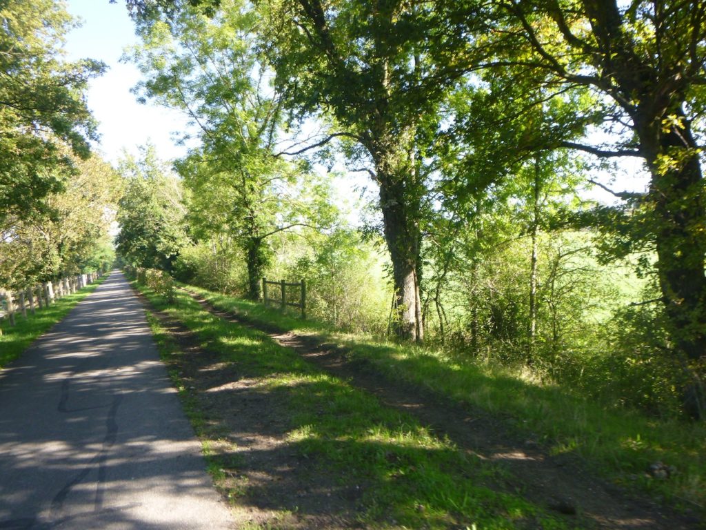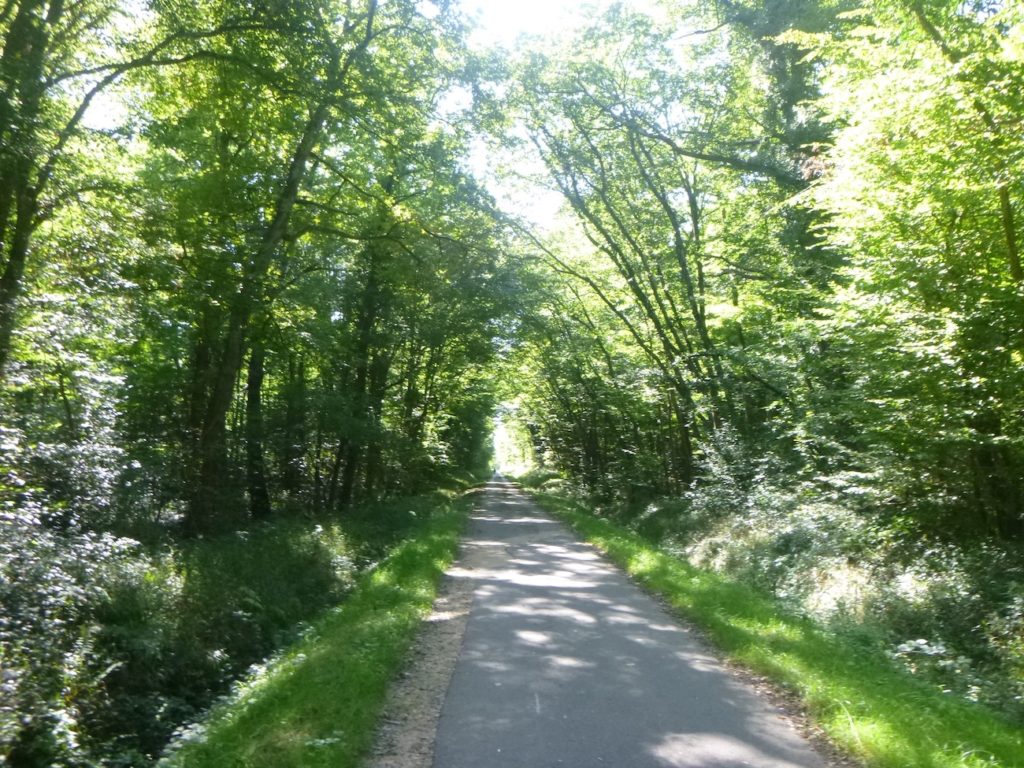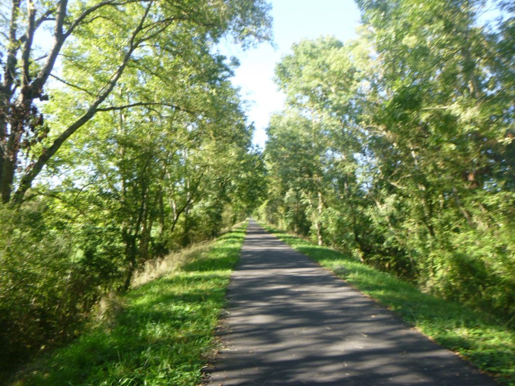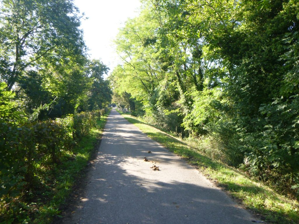 Mais déjà la route reprend son allure obstinée. La piste s’élance de nouveau, droite, implacable, parfois jusqu’à l’ennui. Ce ne sont plus de vastes sous-bois qui l’enserrent, mais de belles haies de feuillus, denses et régulières, qui forment comme un corridor vert, balisant le chemin du cycliste ou du marcheur.