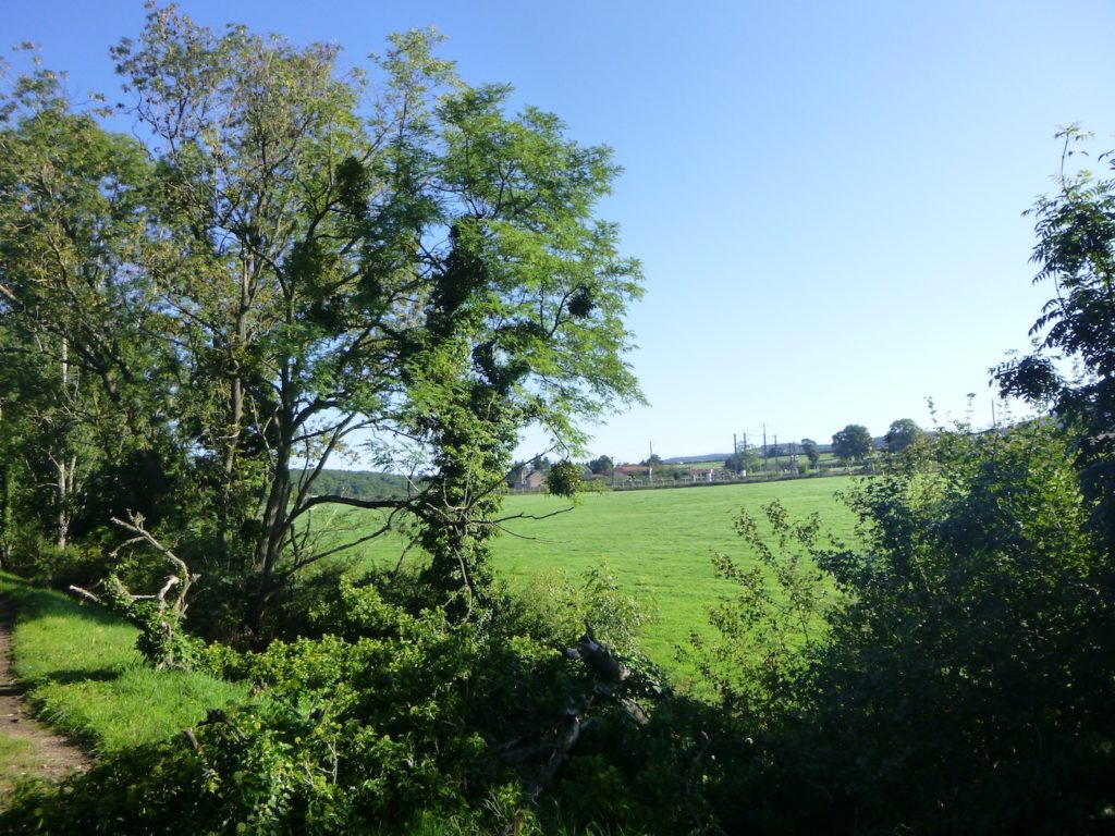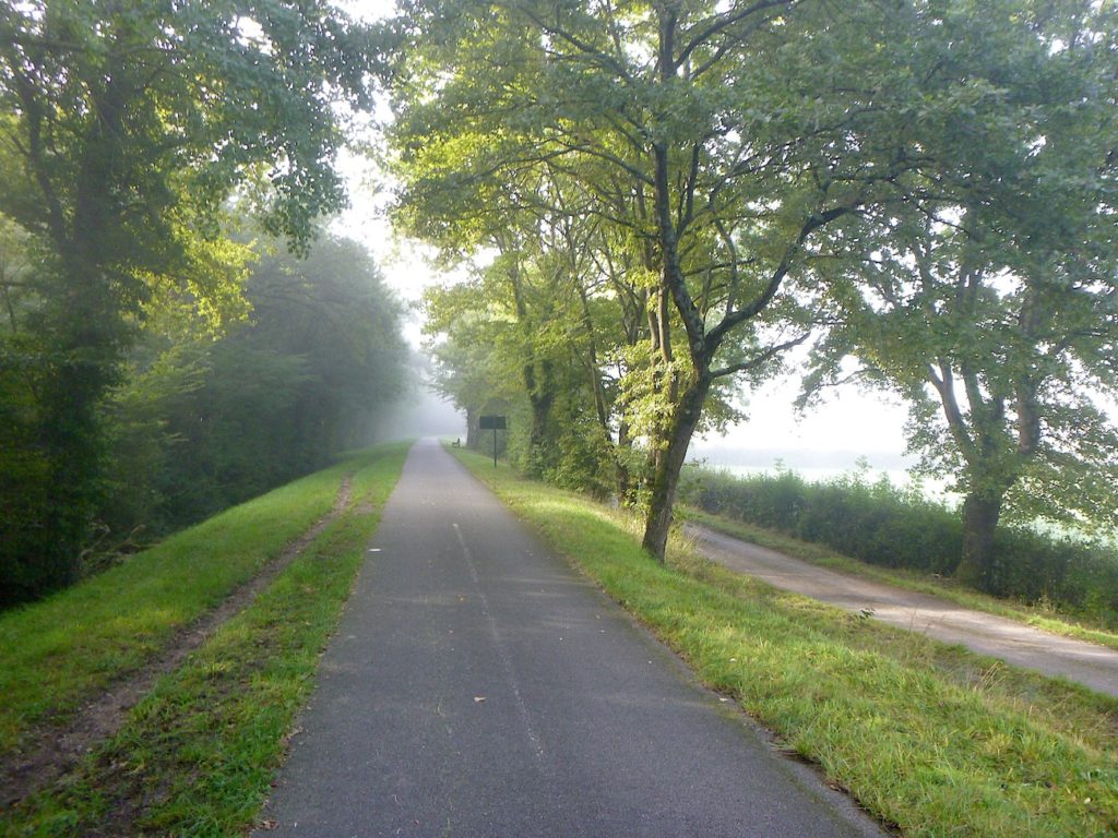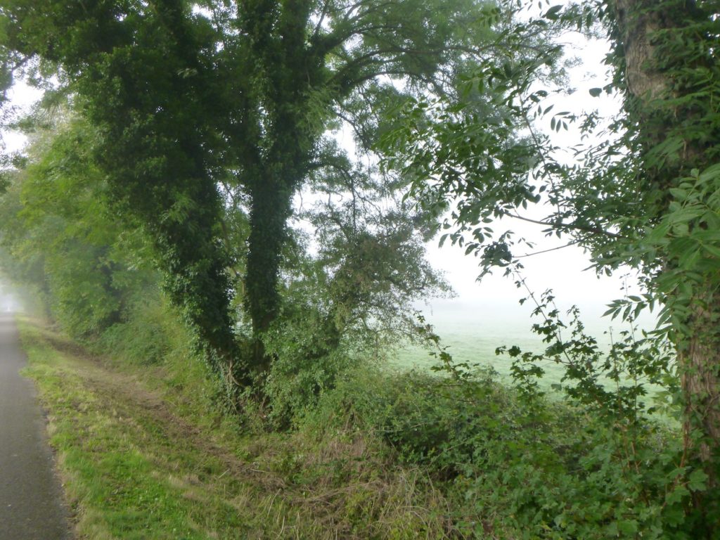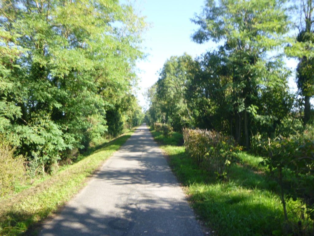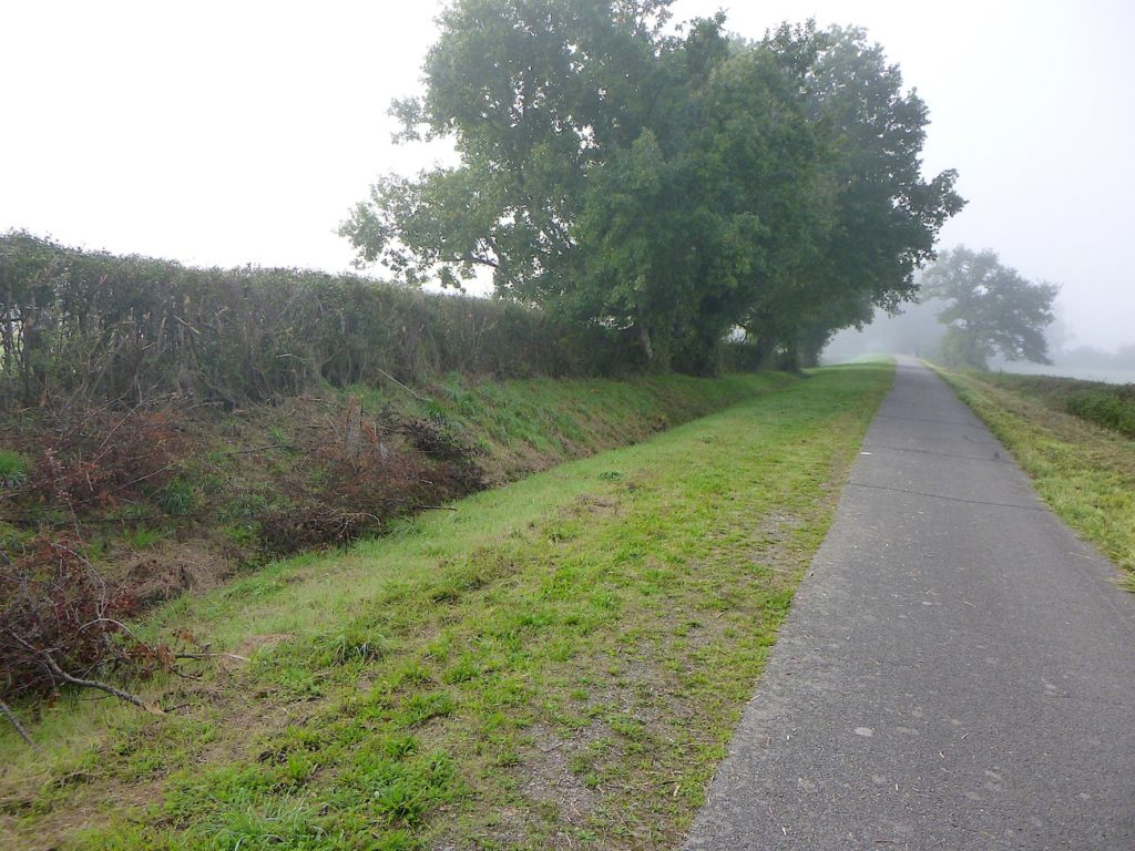 Mais déjà la route reprend son allure obstinée. La piste s’élance de nouveau, droite, implacable, parfois jusqu’à l’ennui. Ce ne sont plus de vastes sous-bois qui l’enserrent, mais de belles haies de feuillus, denses et régulières, qui forment comme un corridor vert, balisant le chemin du cycliste ou du marcheur.