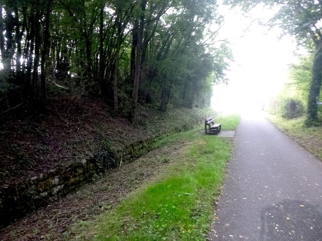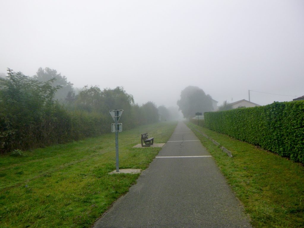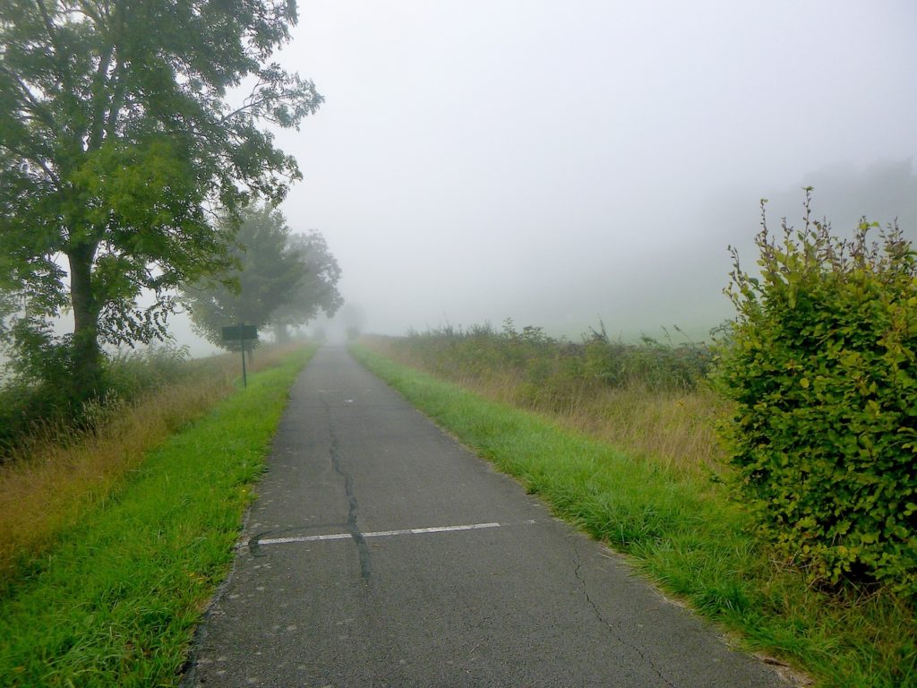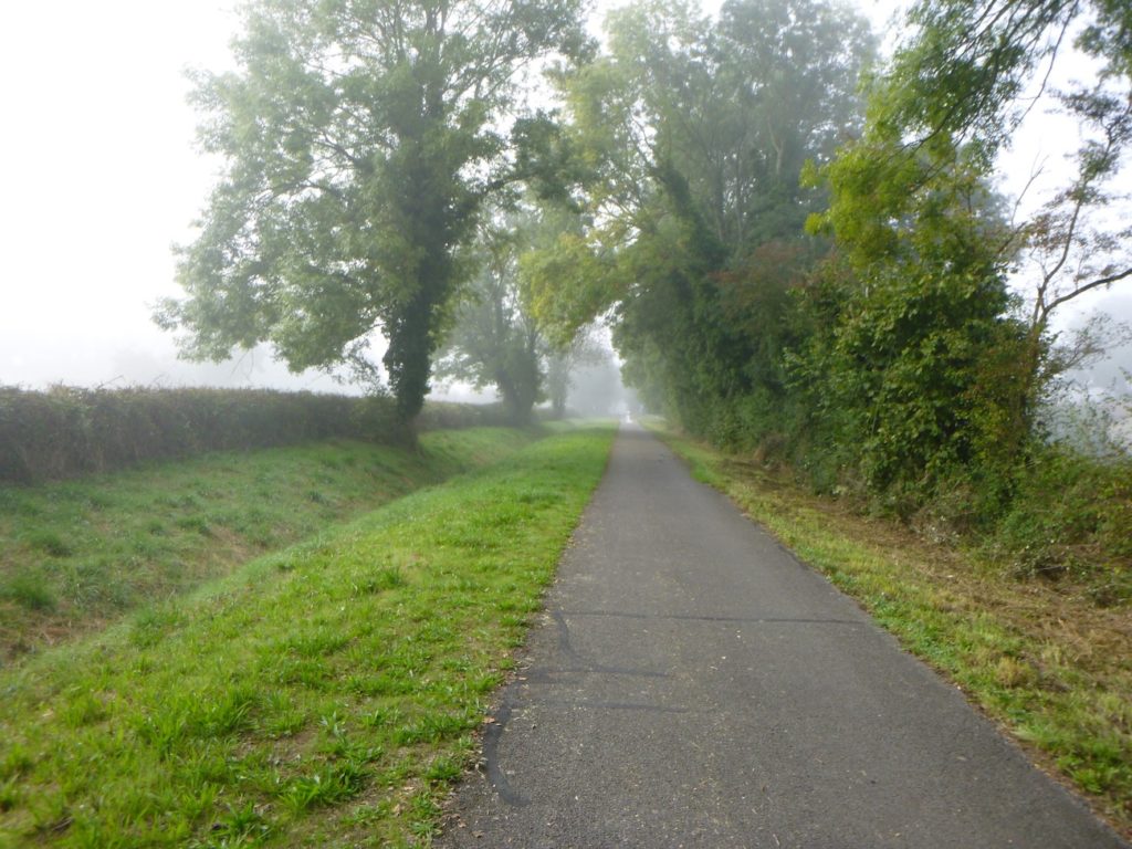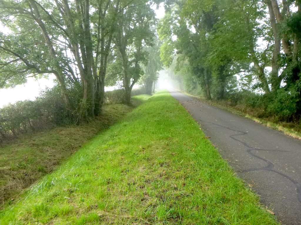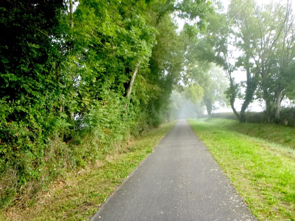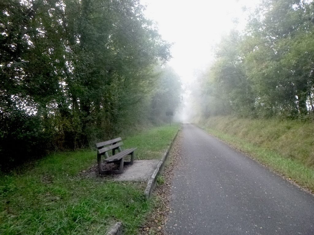 Et la voie verte, ce jour perdue dans le brouillard, poursuit sa route avec obstination : droite comme une pensée fixe, lancinante comme une mélodie qu’on ne parvient pas à chasser, intransigeante comme une règle dont rien ne peut fléchir l’autorité. Elle impose son rythme au marcheur, sans concession.