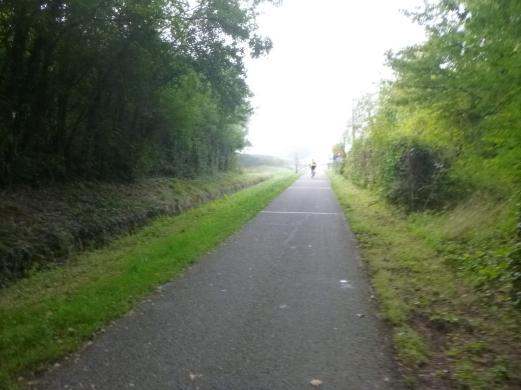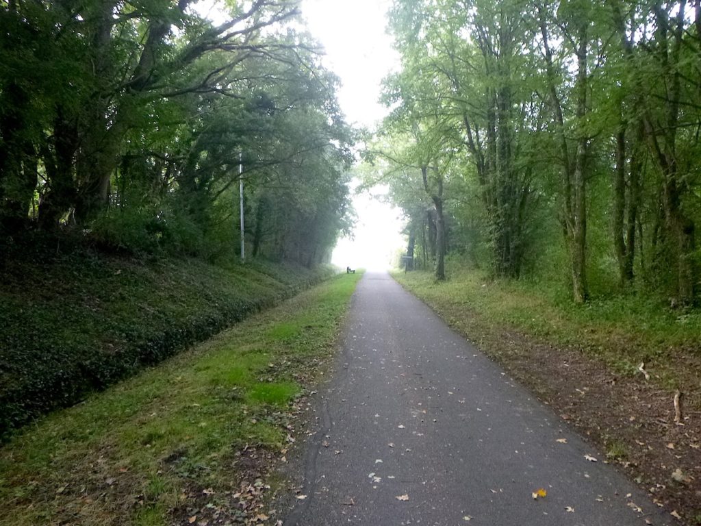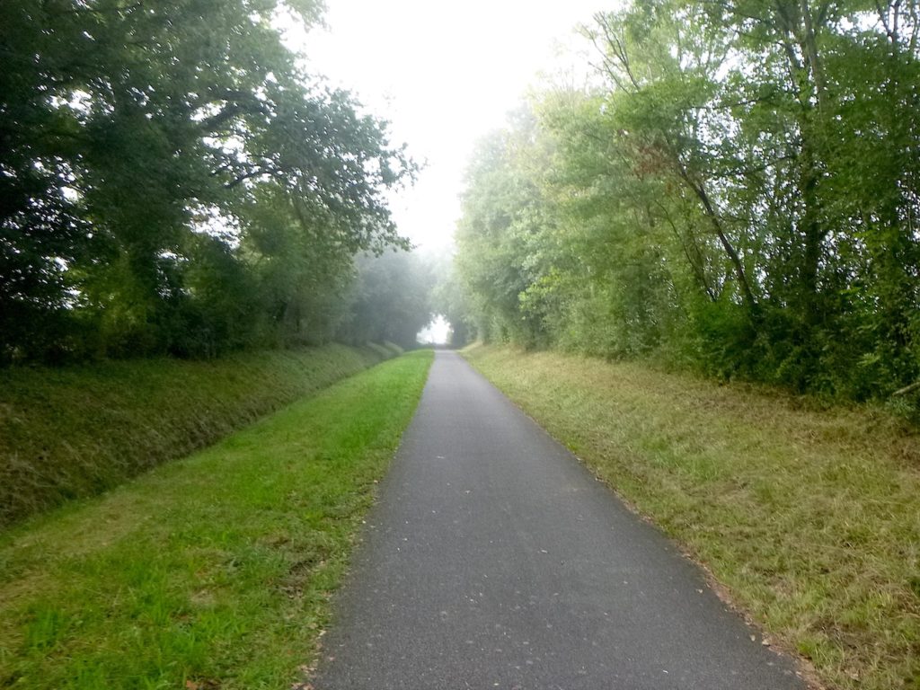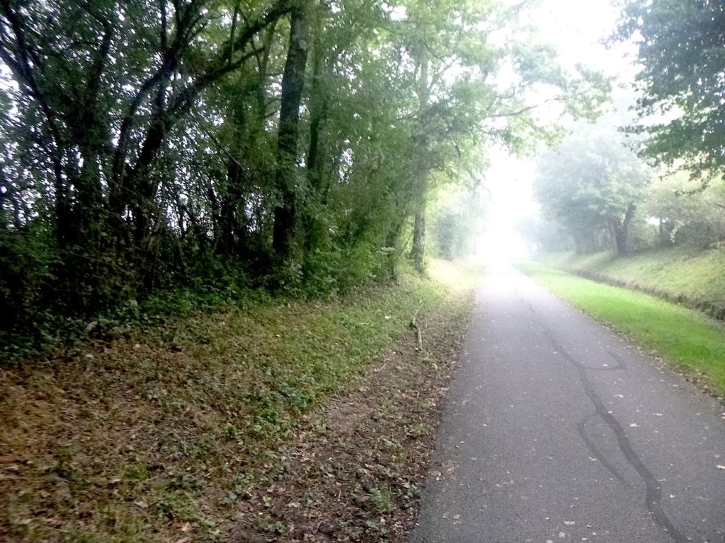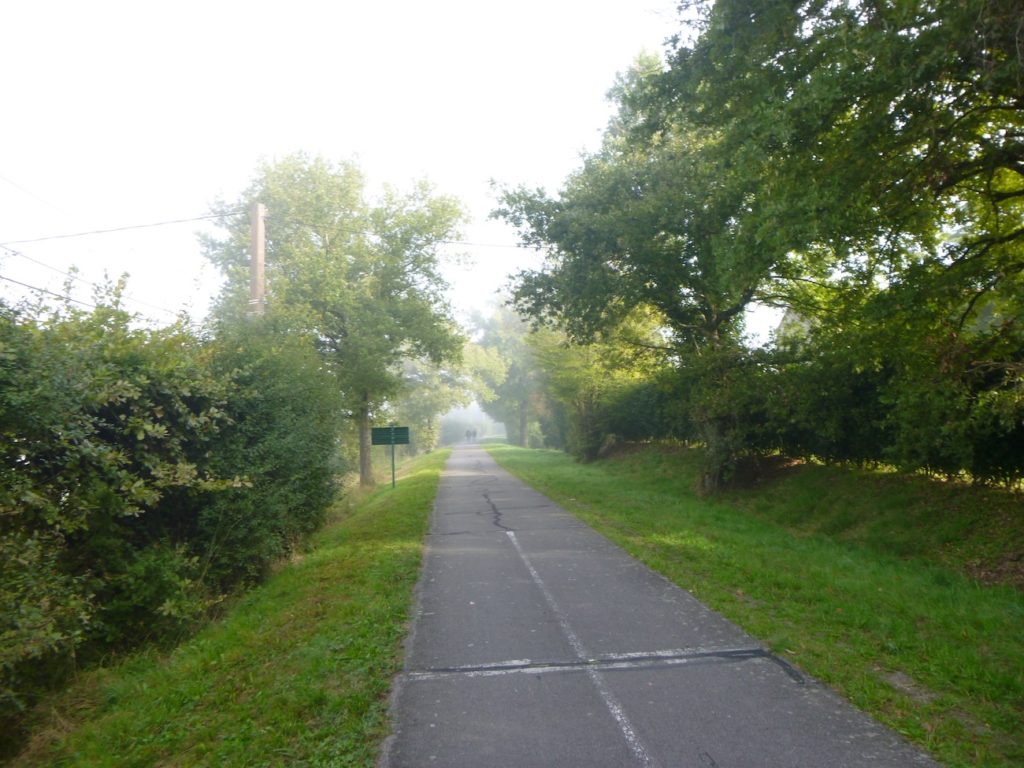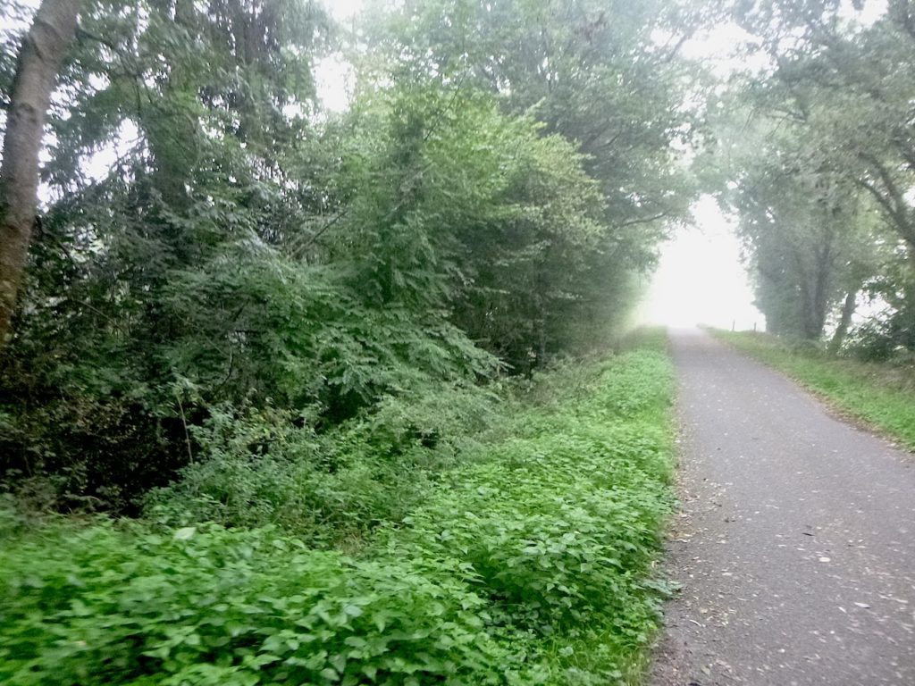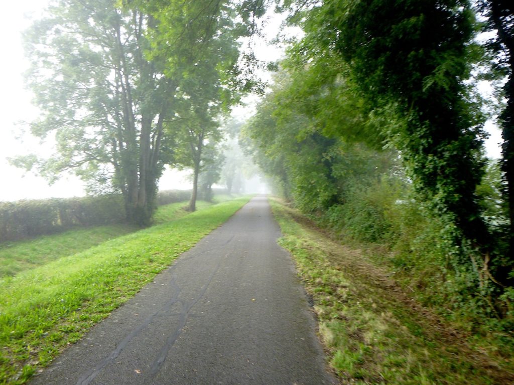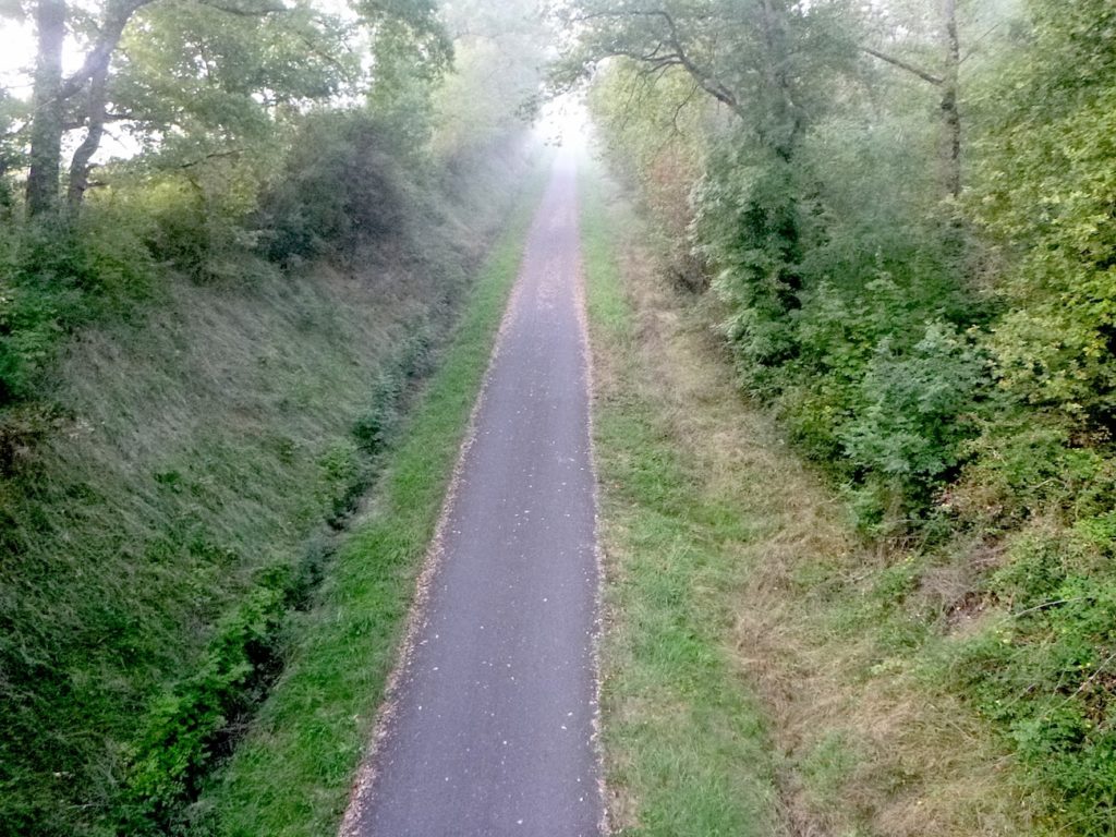 Et la voie verte, ce jour perdue dans le brouillard, poursuit sa route avec obstination : droite comme une pensée fixe, lancinante comme une mélodie qu’on ne parvient pas à chasser, intransigeante comme une règle dont rien ne peut fléchir l’autorité. Elle impose son rythme au marcheur, sans concession.