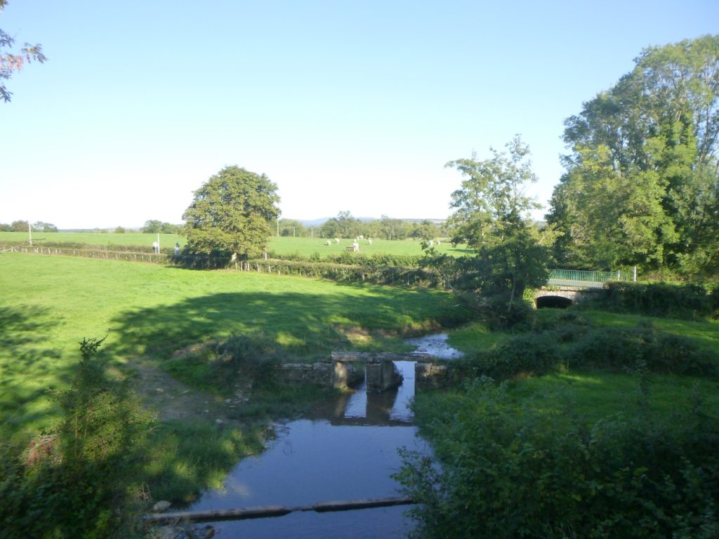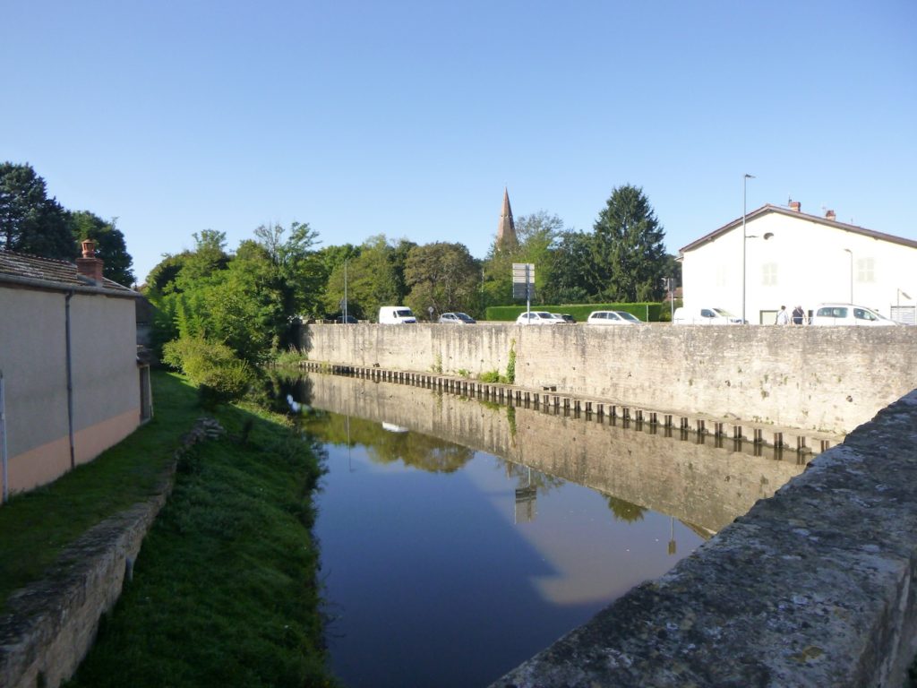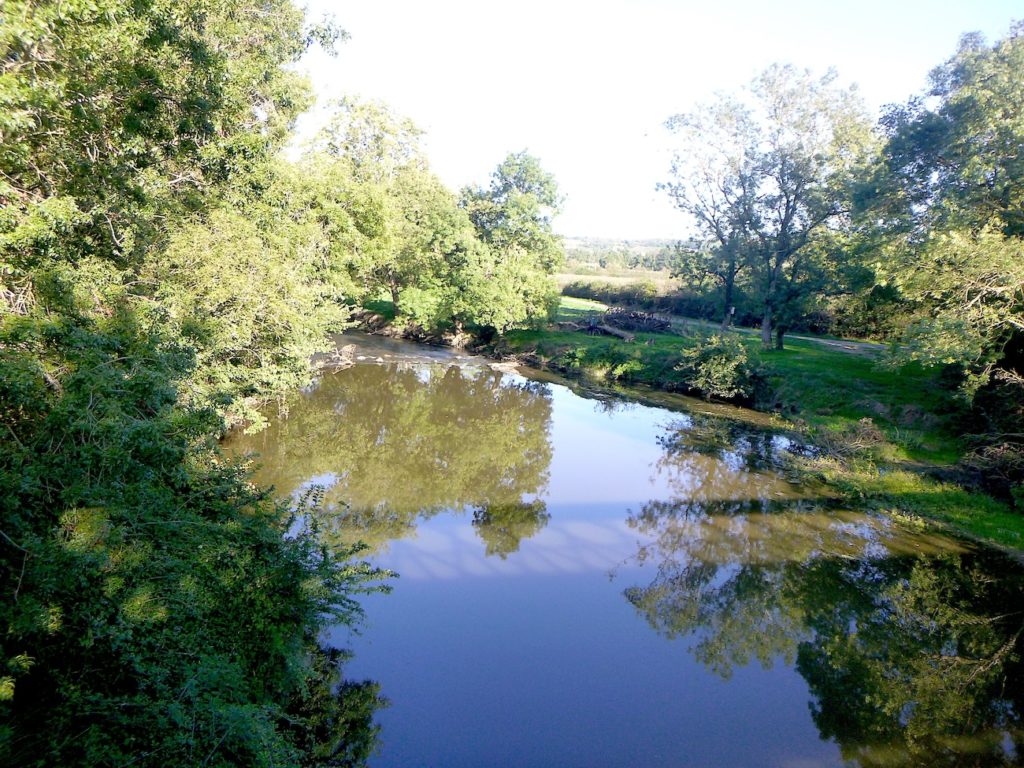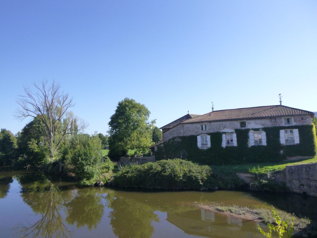 La voilà qui franchit alors la Grosne, la seule grande rivière de la région, que vous retrouverez plus loin encore sur votre parcours. Son cours, d’un peu plus d’une centaine de kilomètres, prend naissance dans les collines du Beaujolais, avant de se perdre dans la vaste Saône, près de Chalon-sur-Saône. Ici, vous remontez donc son courant, comme à contre-temps de son histoire. La Grosne, sombre et tranquille, dessine dans le pays de larges méandres, traçant ses courbes molles à travers prairies et peupleraies. Elle impose au paysage sa respiration lente, presque méditatives.