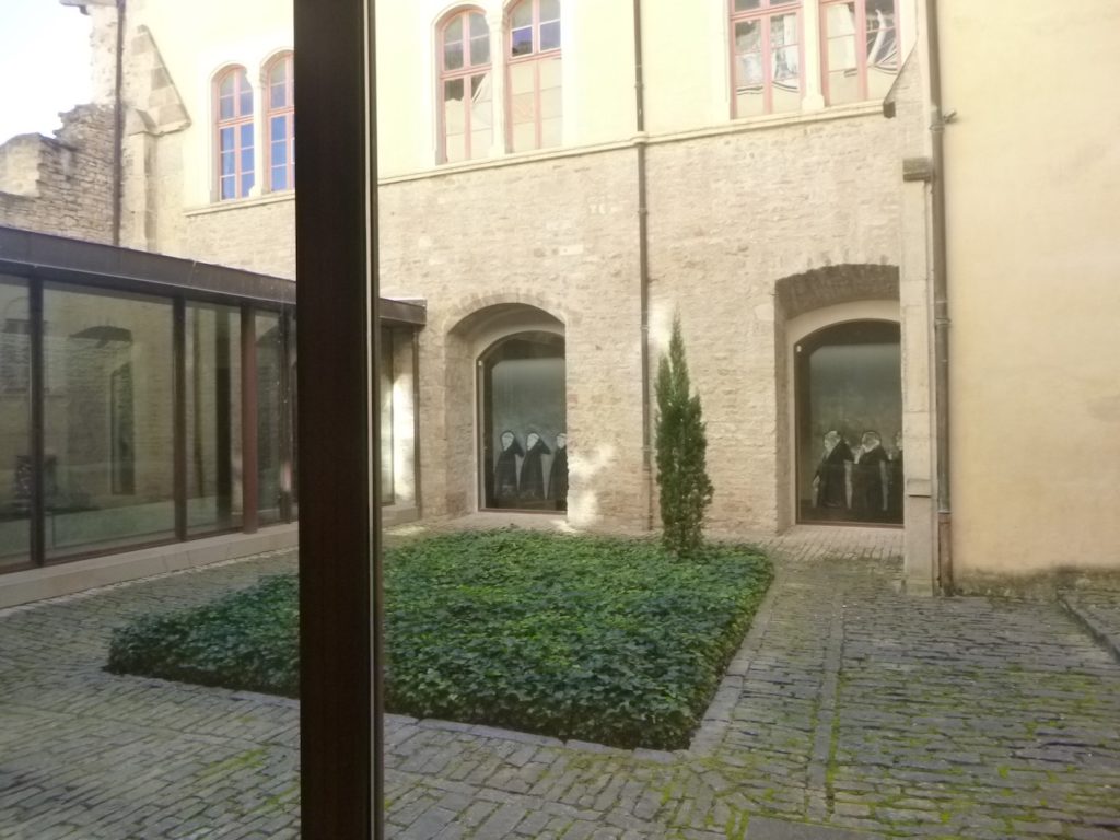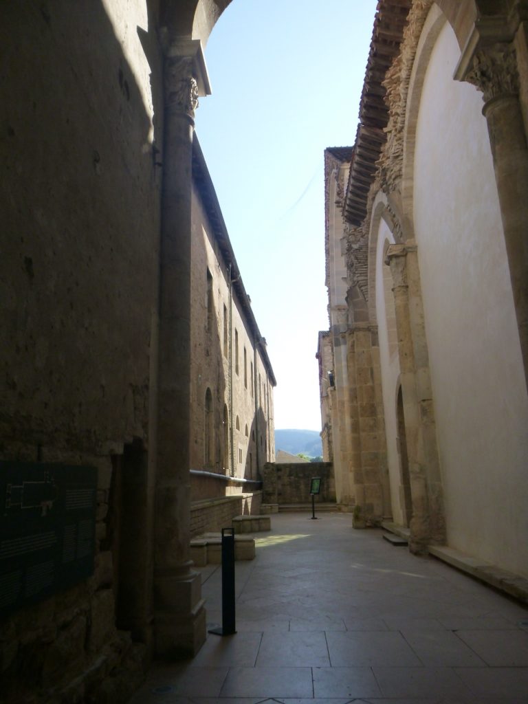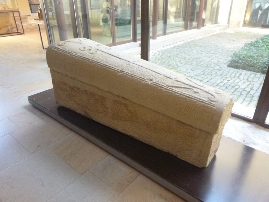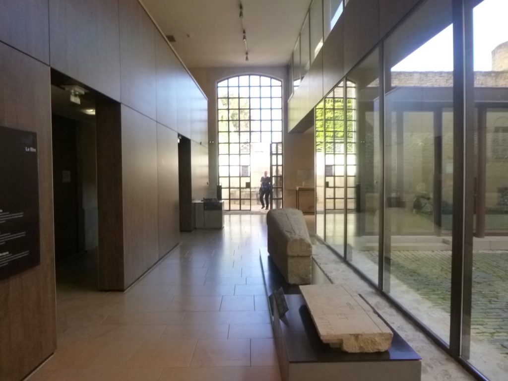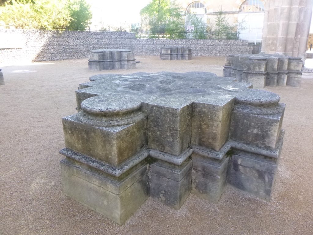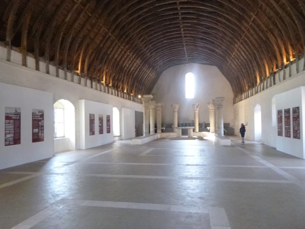 La visite (12 Euros) commence par le petit cloître. Celui-ci était situé au sud de la grande église abbatiale. Construit sans doute à la fin du XIe siècle ou au début du XIIe, il formait un espace plus intime que le grand cloître, cœur de la vie monastique. Comme tout cloître roman, il consistait en une cour carrée entourée de galeries couvertes, soutenues par des colonnettes et décorées de chapiteaux sculptés. Ces galeries permettaient aux moines de circuler à l’abri et offraient aussi un lieu de méditation et de silence. Contrairement au grand cloître, autour duquel se regroupaient les principaux bâtiments conventuels, le petit cloître avait une fonction plus secondaire. Il servait de transition vers des espaces de service ou des activités pratiques, offrant ainsi un cadre plus discret et plus fonctionnel à la communauté. Détruit au XIXe siècle, lors du démantèlement de l’abbaye après la Révolution, le petit cloître a presque entièrement disparu. Il n’en reste aujourd’hui que des vestiges archéologiques et quelques fragments sculptés, que l’on visite comme dans un musée virtuel.