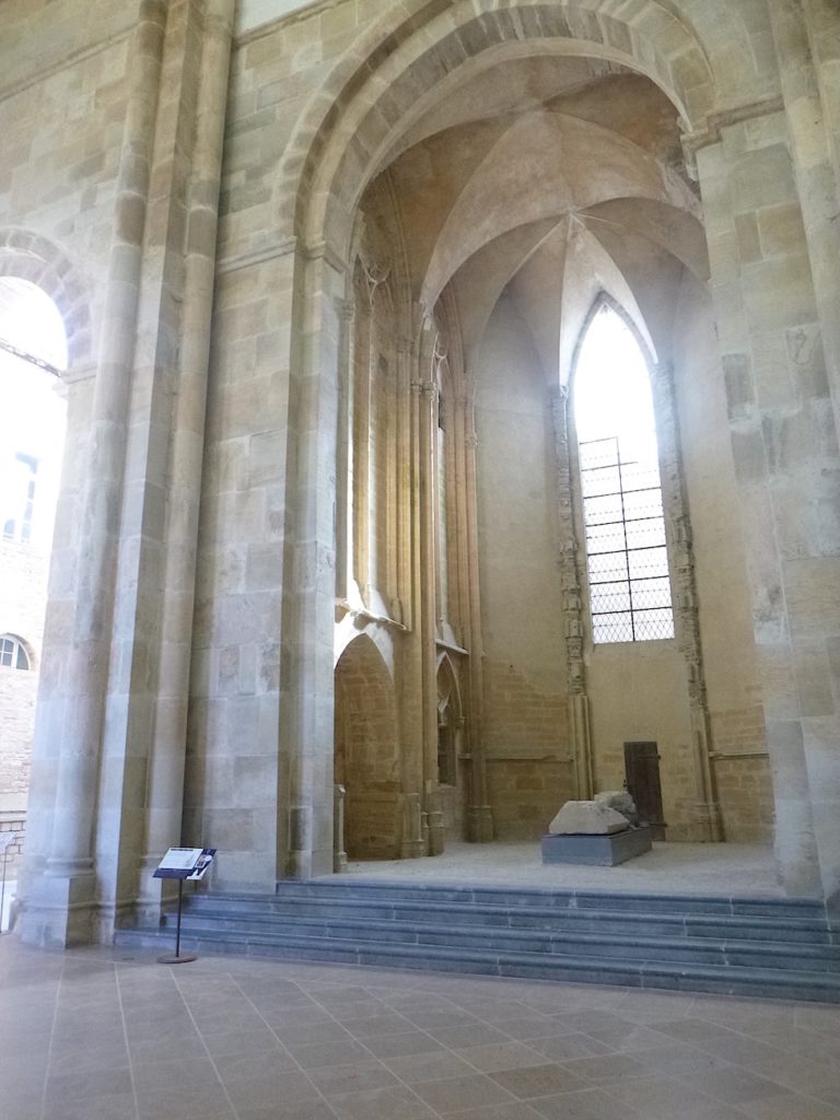 Dans l’espace gisent les socles incroyables de fûts de colonnes, comme des témoins figés d’un monde englouti. Ces bases massives, rongées par le temps, posent à l’œil la question de leur âge véritable : sont-elles les plus anciennes assises de l’abbatiale ou les ultimes vestiges d’une reconstruction oubliée ? Mystère de la pierre, qui garde en silence la mémoire de ses bâtisseurs.