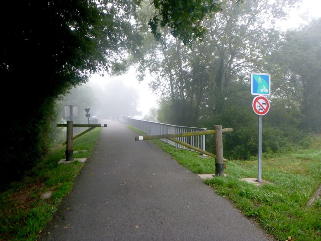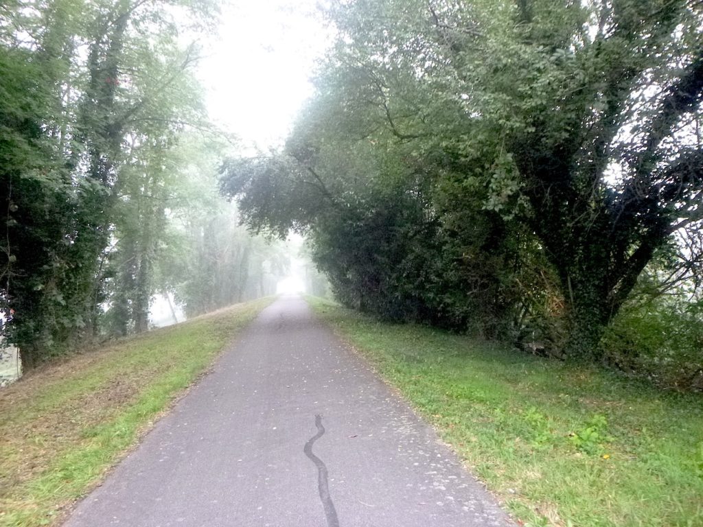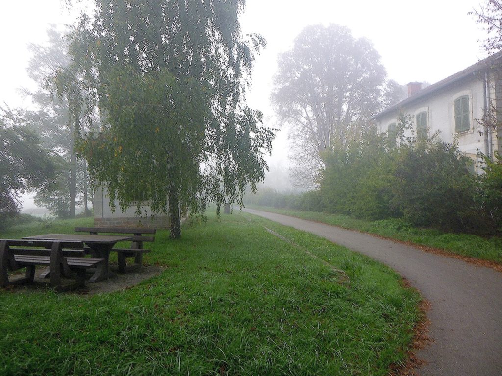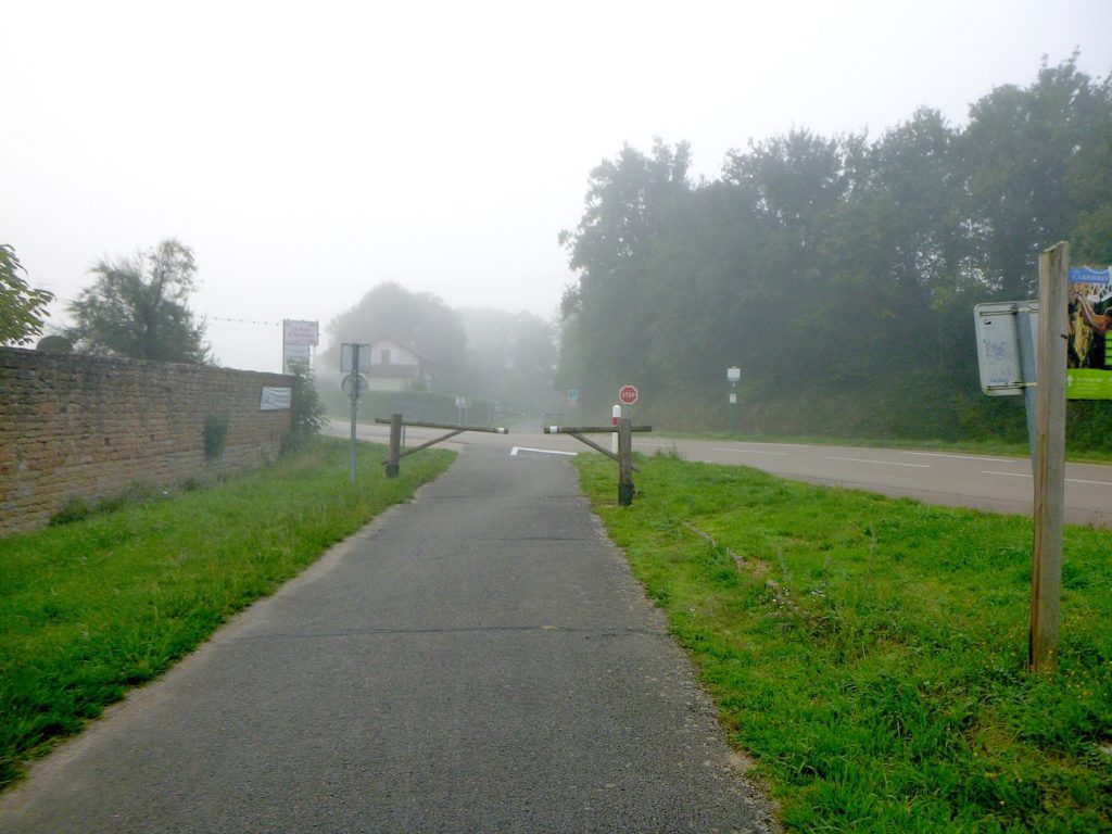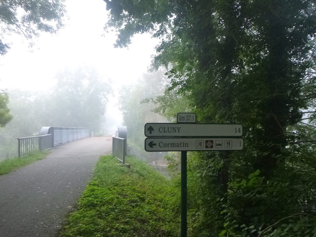 Dans le brouillard, la piste poursuit son tracé, comme une ligne têtue qui ne cède pas à l’opacité du matin. Les seuls repères, modestes mais indispensables, deviennent des haltes discrètes : un banc qui invite au repos, une intersection qui propose l’hésitation, ou parfois une simple indication de détour, un chiffre qui mesure la patience du marcheur. Ici, la piste parvient à la bifurcation de Cormatin. Vous y croiserez sans doute nombre de cyclistes se dirigeant vers le village, happés par sa promesse. Cormatin, avec ses commerces vivants et ses restaurants accueillants, dresse une halte avant l’arrivée tant attendue à Cluny. Pour le cycliste, un détour d’un kilomètre n’est qu’une respiration dans l’élan. Pour le marcheur, c’est déjà une autre histoire : une hésitation, une fatigue à calculer. Ici, la piste se rapproche à nouveau de la Grosne, ce ruban d’eau qui accompagne la route comme une ombre mouvante.