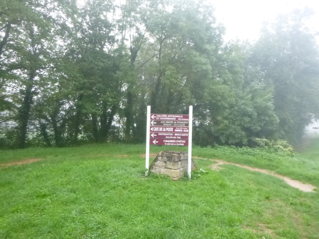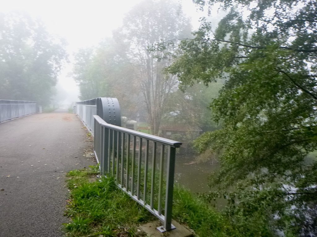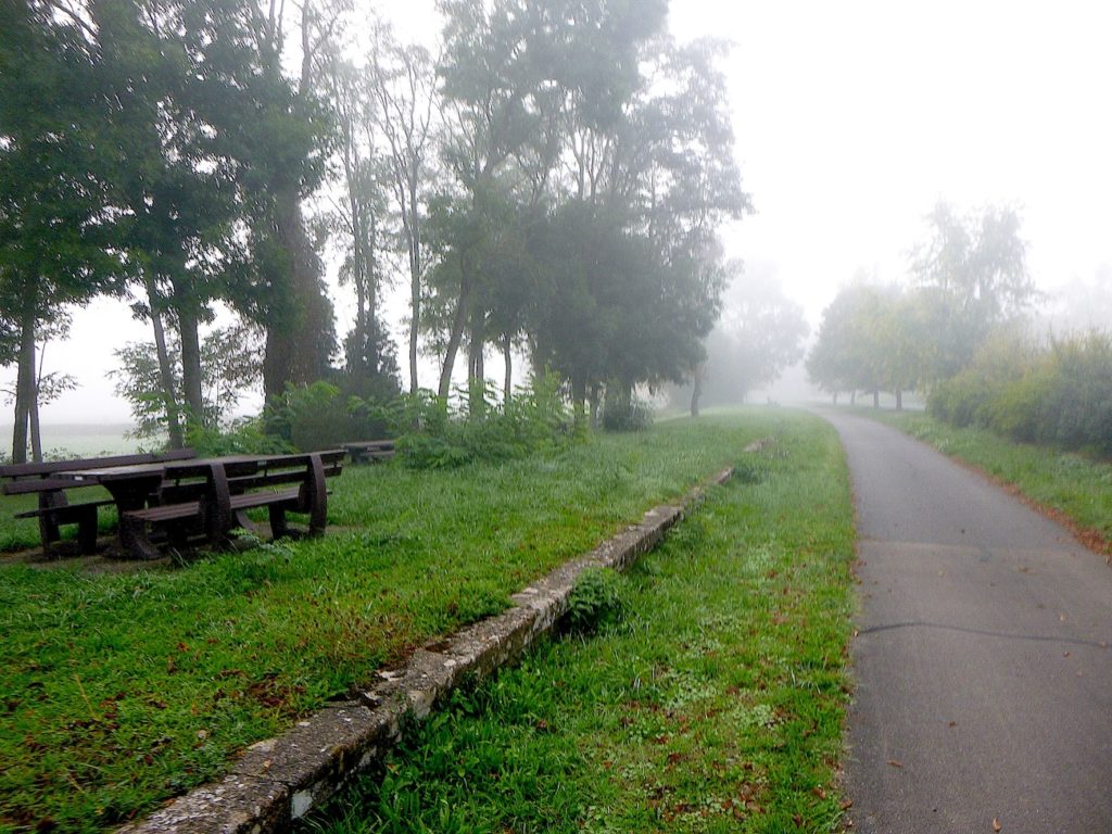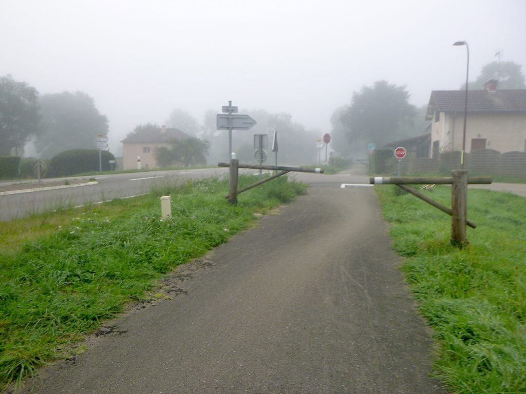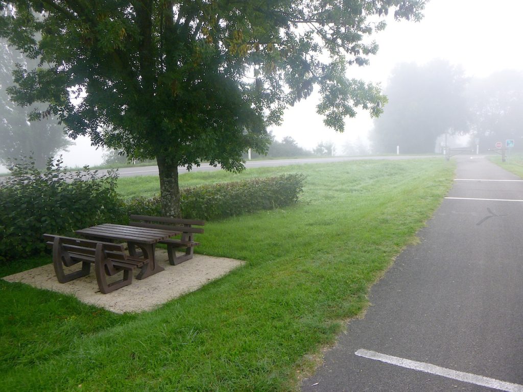Dans le brouillard, la piste poursuit son tracé, comme une ligne têtue qui ne cède pas à l’opacité du matin. Les seuls repères, modestes mais indispensables, deviennent des haltes discrètes : un banc qui invite au repos, une intersection qui propose l’hésitation, ou parfois une simple indication de détour, un chiffre qui mesure la patience du marcheur. Ici, la piste parvient à la bifurcation de Cormatin. Vous y croiserez sans doute nombre de cyclistes se dirigeant vers le village, happés par sa promesse. Cormatin, avec ses commerces vivants et ses restaurants accueillants, dresse une halte avant l’arrivée tant attendue à Cluny. Pour le cycliste, un détour d’un kilomètre n’est qu’une respiration dans l’élan. Pour le marcheur, c’est déjà une autre histoire : une hésitation, une fatigue à calculer. Ici, la piste se rapproche à nouveau de la Grosne, ce ruban d’eau qui accompagne la route comme une ombre mouvante.