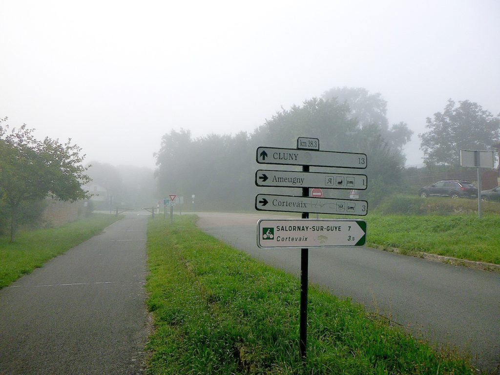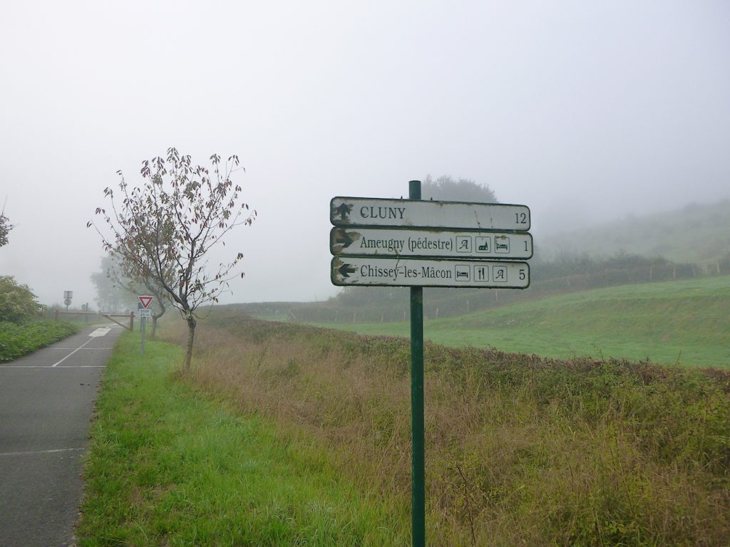 Encore une intersection, presque immédiate, vous conduit à Ameugny, tout proche, à deux pas de la piste. À peine un kilomètre s’est écoulé depuis la dernière bifurcation, et déjà l’on vous rappelle que Cluny reste à douze kilomètres d’ici. Ce chiffre, inscrit sur les panneaux, agit comme une petite mesure du temps : une promesse pour les cyclistes pressés, un rappel d’effort pour les marcheurs patients. .